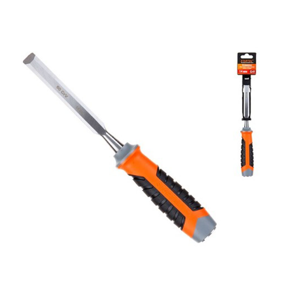 Стамеска 14 мм STARTUL Profi - универсальна в использовании. Инструмент подойдет для работы вручную, а также вместе с молотком. Металлический тыльник безопасен в работе. Стамеска оснащена скошенными краями - это исключает застревание инструмента. Удобная профилированная рукоять значительно облегчает процесс снятия слоя древесины.