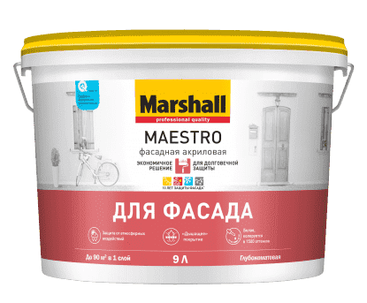 Глубокоматовая водно-дисперсионная (латексная) краска для наружных работ. При нанесении образует гладкое высокоукрывистое, атмосферостойкое покрытие, с хорошими грязе- и водоотталкивающими свойствами. Глубокоматовая структура визуально делает поверхность более ровной, позволяя скрыть небольшие дефекты. Срок службы покрытия на фасадных поверхностях до 10 лет (согласно заключению ГБУ Центр «ЭНЛАКОМ» по определению долговечности комплексного покрытия).Для наружных работ. Подходит для нанесения на полностью просохшие минеральные поверхности (бетон, штукатурка, кирпич и т. п.). Рекомендуется для окраски фасадов жилых и общественных зданий, подземных гаражей, остекленных балконов, лоджий, тамбуров.