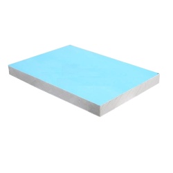 Сендвич панель обладает совокупностью свойств: хорошей жесткостью при малом весе, отличной теплоизоляцией, хорошим внешним видом. Панель с одной стороны защищена полиэтиленовой пленкой. В середине панели находится вспененный полистирол с закрытой ячеистой структурой.