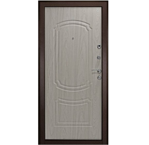 Фаворит Дверной Континент - надежная входная дверь класса КОМФОРТ, изготовленная из легированной холоднокатаной стали, толщиной 1,2 мм. с антивандальным покрытием Медь Антик. Внутренняя отделка двери - декоративная МДФ панель, покрытая Эко Шпоном в благородном цвете Беленый Дуб. Высокие показатели по тепло-шумоизоляции обеспечиваются благодаря наполнению дверного полотна негорючей минеральной ватой.