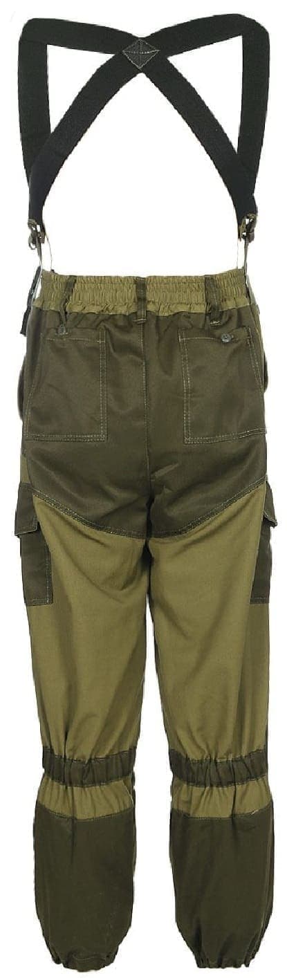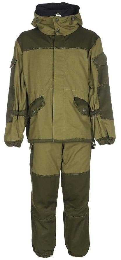 Костюм "Горка" изготавливается из палаточной 100% х/б ткани. Усиление критических для изнашивания и промокания зон осуществляется из ткани "грета". Сочетание накладок и основной ткани обеспечивает разбиение силуэта человека на удаленных расстояниях для дополнительной маскировки. Куртка и брюки свободного покроя. Костюм имеет систему стяжек на основе резино-тканевой тесьмы по бокам куртки, на рукавах, под коленями и внизу брюк. Брюки комплектуются удобными подтяжками. Низ брюк на завязке. Куртка костюма и брюки утеплены флисовой подстежкой.