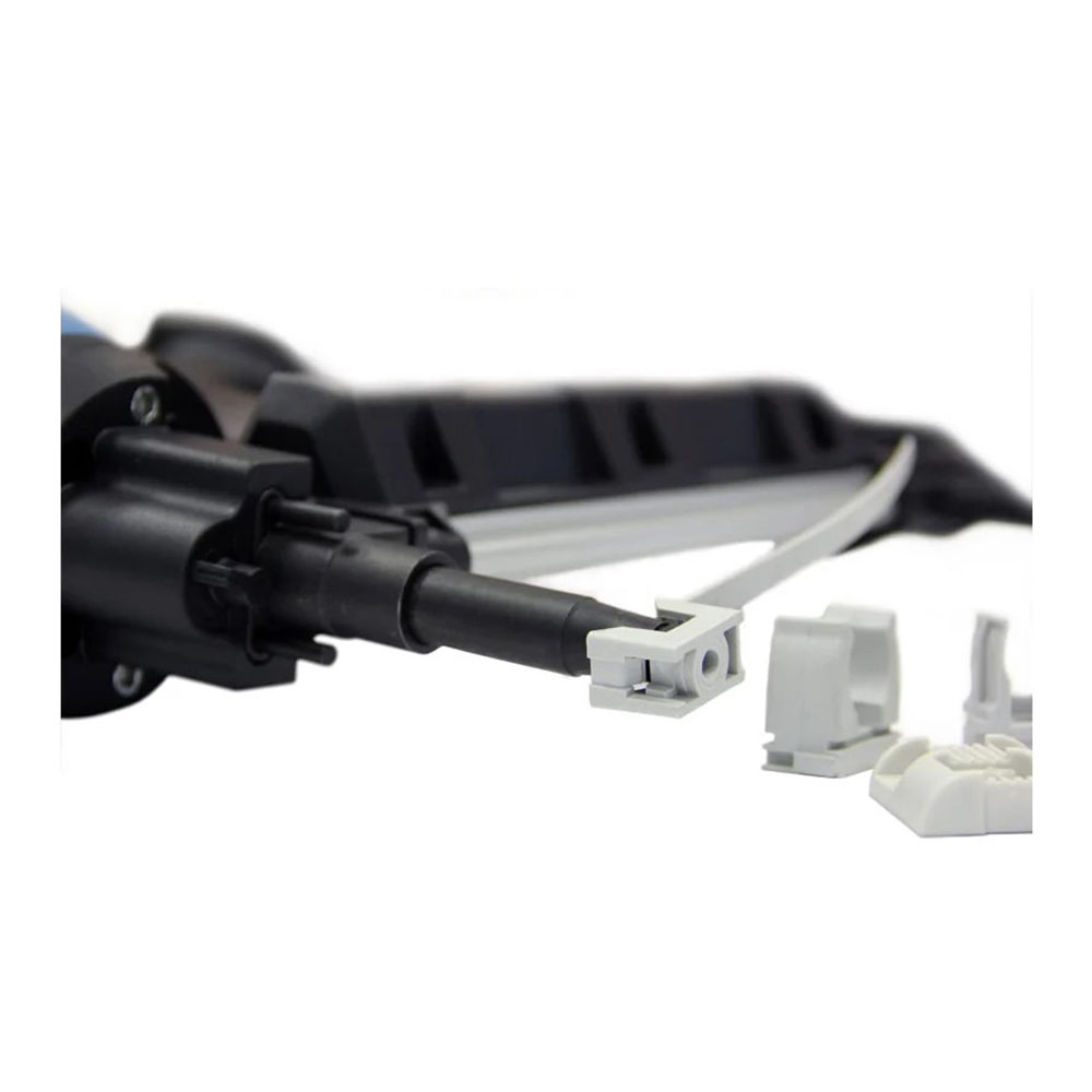 Газовый монтажный пистолет ствол для электромонтажа GSN50E Toua - является наиболее универсальной моделью в линейке газовых монтажных пистолетов Toua и представляет собой самый популярный газовый монтажный пистолет Toua GSN50 в комплектации со стволом для электромонтажа. Основной особенностью этого инструмента является отсутствие прижимной скобы и узкий ствол для электромонтажа. В данной модификации сам ствол выполняет роль прижимного механизма, защищающего от «выстрела в воздух». Благодаря этому пистолет имеет очень компактные размеры и может использоваться для монтажа широкого диапазона клипс от различных производителей диаметром от 16 мм. Наличие регулировки заглубления делает выстрел из данного инструмента мягче и уменьшает вероятность раскалывания пластика при монтаже кабель каналов. Узкий ствол упрощает прицеливание в монтажное отверстие.