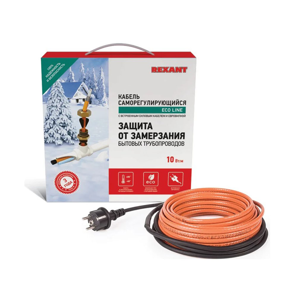 Кабель греющий саморегулирующийся пищевой SRP 10HTM2-CT в трубу 10 м/100Вт REXANT - Греющий провод соединён с питающим кабелем, на конце которого расположена евровилка для подключения к сети 220 В. В нормальных условиях температура нагревательного шнура не превышает 65 °C. Комплекты подходят для использования как в помещении, так и на улице благодаря классу защиты IP67. Кабель можно установить на поверхность металлической или пластиковой трубы, под теплоизоляцией, а также внутрь трубы, включая трубы с питьевой водой. Витки могут пересекаться друг с другом. Монтаж в трубе осуществляется с помощью комплекта для ввода кабеля (арт. 51-0610-1 или 51-0610-2). При установке на поверхности трубы витками необходимо следить за минимальным радиусом изгиба кабеля — 40 мм.