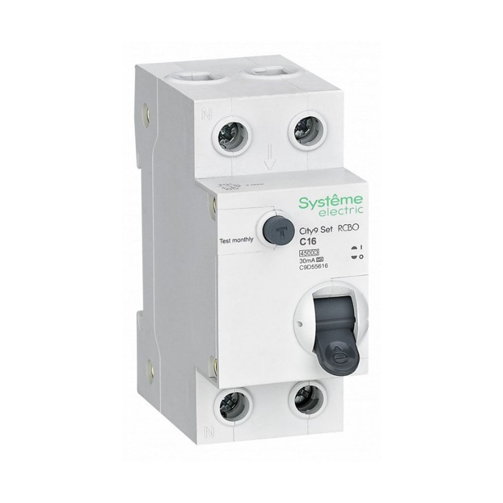 Автоматический выключатель дифференциального тока АВДТ 1P+N С 16А 4.5kA 30мА тип A 230В City9 Set C9D55616 Systeme Electric - применяется в электрических сетях напряжением 230В. Предназначен для защиты сети от перегрузок, людей от поражения электрическим током и токов короткого замыкания. Уставка по току утечки 30 мА обеспечивает гарантированную защиту людей при прямом прикосновении. Кнопка тест обеспечивает проверку работоспособности аппарата. Крепление на DIN-рейку шириной 35 мм. Безопасные клеммы.