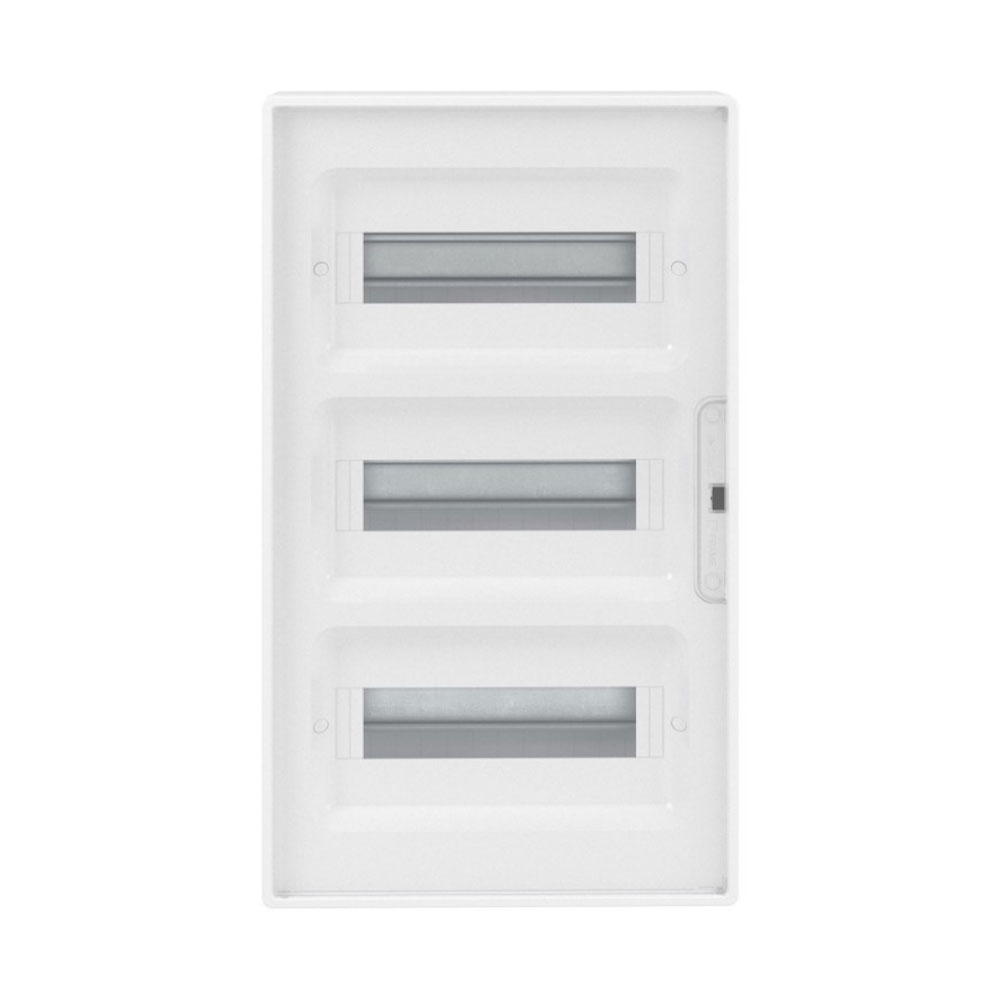 Корпус пластиковый настенный FRAME ЩРН-П-36 IP41 прозрачная дверь F36W1WT DKC - предназначен для монтажа в жилых и административных помещениях. Применяется для установки модульных устройств. Установка стандартных латунных шин возможна по всем стенкам корпуса щитка. Единый корпус шинодержателя можно разделить на сегменты, и использовать отдельно. Симметричный корпус щитка позволяет открывать дверь слева или справа. Количество модулей - 36. Цвет корпуса белый, цвет двери - прозрачная, ширина - 311,6 мм, высота - 529,1 мм, глубина - 102,8 мм. Материал - термостойкий и ударопрочный пластик. В комплекте: DIN-рейка из гальванической оцинкованной стали, сборочные винты для сборки щитка, 4 шины PEN 2 на 8 отверстий + 2 на 10 отверстий, 2 шинных держателя на 7 сегментов, наклейки для маркировки, инструкция по сборке.
