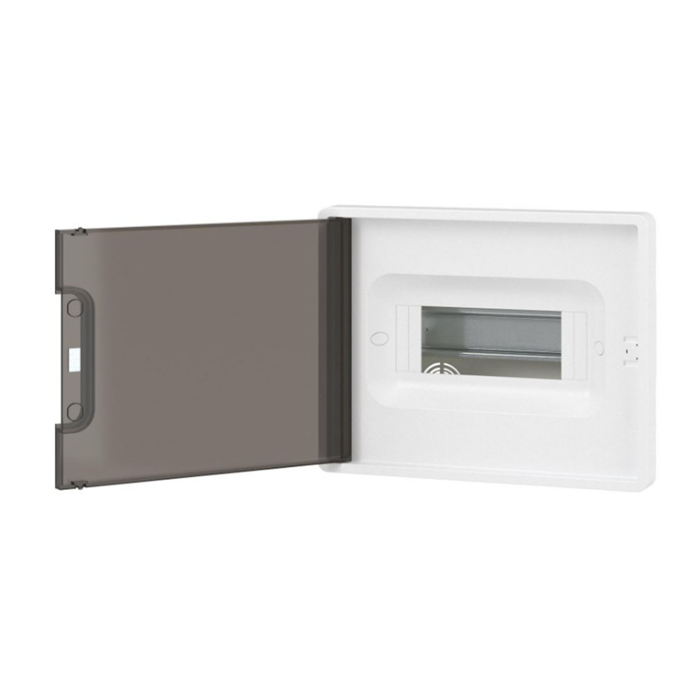 Корпус пластиковый встраиваемый FRAME ЩРВ-П-8 IP41 тонированная дверь F08B1WD DKC - предназначен для монтажа скрытым способом в бетонные\кирпичные стены в жилых и административных помещениях. Применяется для установки модульных устройств. Съемная рама с DIN-рейками позволяет сначала смонтировать и подключить силовое оборудование и затем установить его в основание щитка в стену. Установка стандартных латунных шин возможна по всем стенкам основания. За счет симметричного конструктива щитка есть возможность изменения направления открывания дверцы. Количество модулей - 8. Цвет корпуса белый, цвет двери - тонированная, ширина - 224 мм, высота - 181 мм, глубина - 99,5 мм. Материал - термостойкий и ударопрочный пластик. В комплекте 2 шины PEN на 6 и 8 отверстий.