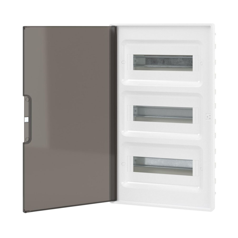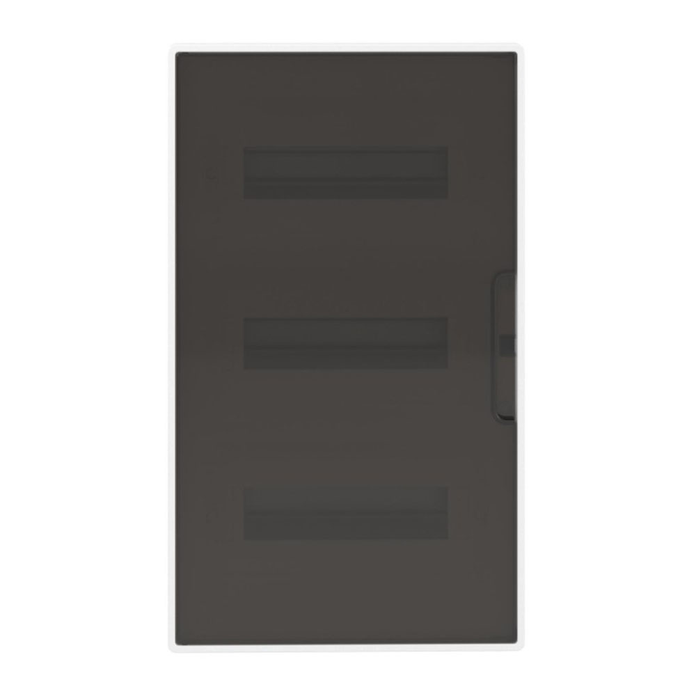 Корпус пластиковый встраиваемый FRAME ЩРВ-П-36 IP41 тонированная дверь F36B1WD DKC - предназначен для скрытого монтажа в бетонные\кирпичные стены. Применяется для установки модульных устройств. Съемная рама с DIN-рейками позволяет сначала смонтировать и подключить оборудование и затем установить его в основание щитка в стену. Установка стандартных латунных шин возможна по всем стенкам корпуса и на боковую сторону съемной рамы щитка. Единый корпус шинодержателя можно разделить на сегменты и использовать отдельно. Симметричный корпус щитка. Количество модулей- 36. Цвет корпуса белый, цвет двери- тонированная, ширина- 311,6 мм, высота- 529,1 мм, глубина- 100 мм. Материал- термостойкий и ударопрочный пластик. В комплекте DIN-рейка из гальванической оцинкованной стали, 4 шины PEN по 2шт на 8 и 10 отверстий.