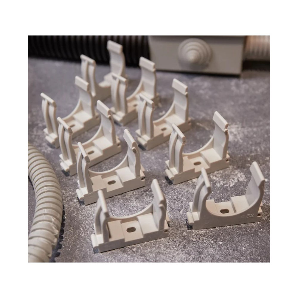 Держатель-клипса с защелкой для монтажного пистолета Ø 32 мм для труб Серая REXANT - предназначен для крепления пластиковых труб к стене, потолку или полу. Выдерживает повышенные механические нагрузки, возникающие при монтаже с использованием пневмопистолета. Изготовлен из качественных материалов по современным технологиям пластикового литья. Изделие оснащено фиксаторами типа "шип-паз": при установке возможно соединять крепежи-клипсы различных диаметров. Для установки элемента предусмотрено технологическое отверстие под дюбель или саморез, а также уменьшенное отверстие под гвоздь по бетону. Широкие лапки изделия обеспечивают надежную фиксацию труб без возникновения замятий. Благодаря качественному пластику и прочным ребрам жесткости крепеж-клипса не ломается и не ослабляется под воздействием низких и высоких температур.