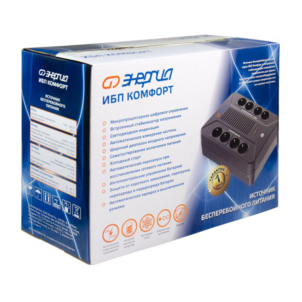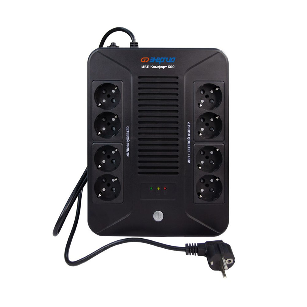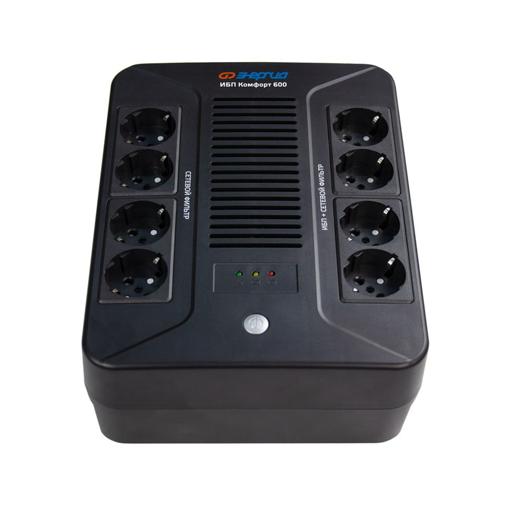 Источник бесперебойного питания ИБП 600ВА/360Вт работа от АКБ 5-17 м Энергия Комфорт - предназначен для защиты персональных компьютеров, аудио–видеоаппаратуры, офисной техники и другого оборудования небольшой мощности. Прибор прост в эксплуатации и оснащен восемью розетками, четыре из которых работают в режиме источника бесперебойного питания, стабилизатора и сетевого фильтра, и четыре в режиме сетевого фильтра.