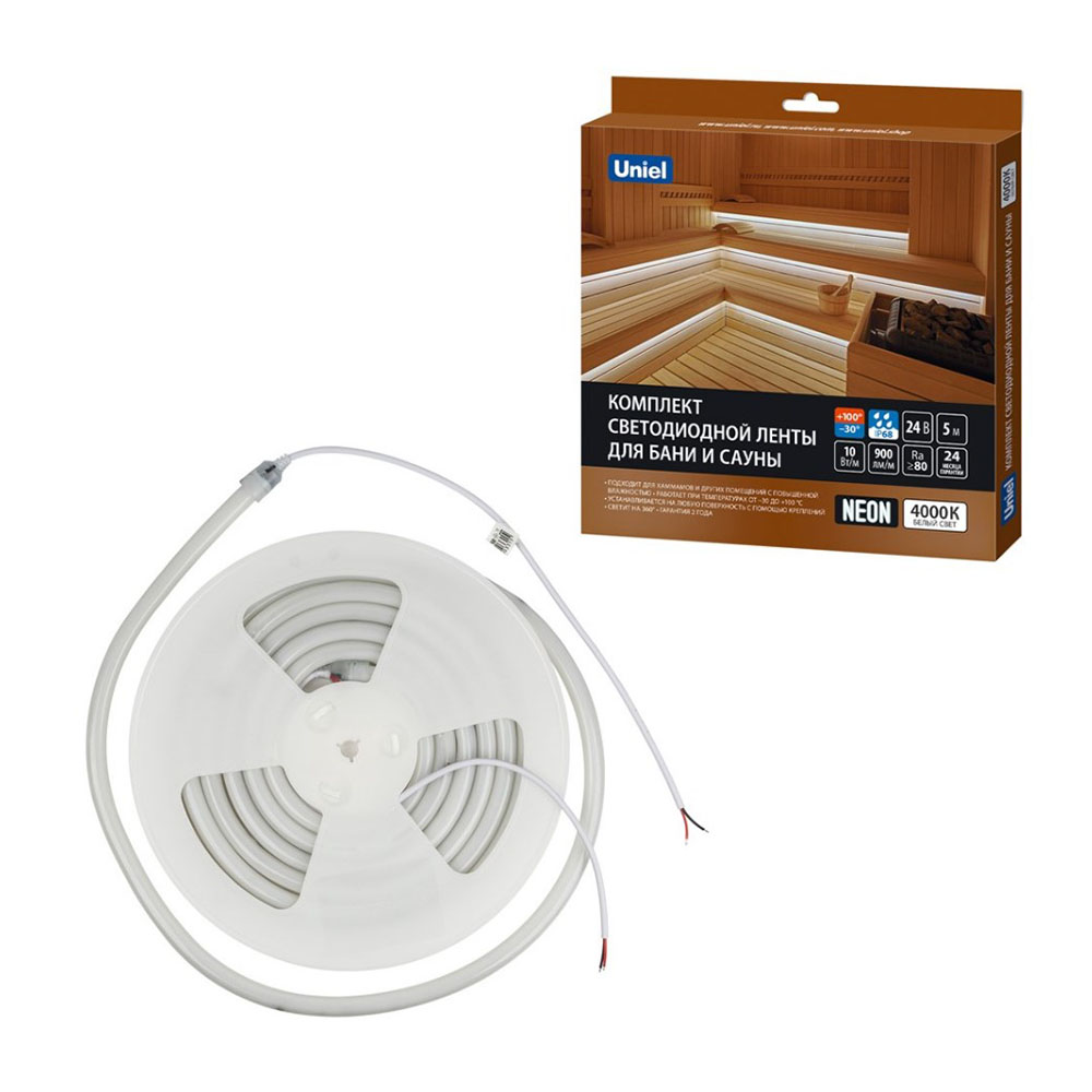 Комплект светодиодной ленты для бань и саун до +100°C 5 м 4000К ULS-N40 IP68 DC24V 10W/m Uniel - разработанный специально для экстремальных условий, этот комплект сочетает в себе передовые технологии и бескомпромиссную надежность, обеспечивая долговечное и комфортное освещение там, где другие решения терпят крах.