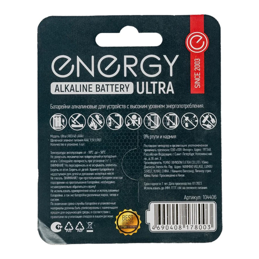 Батарейка Тип ААА ENERGY Ultra LR3/4В - гарантируют надежность и удобную установку. Различные дополнительные преимущества, такие как простота в эксплуатации, длительное использование - все это делает эти батарейки действительно выгодным выбором для покупателей. Серия Ultra на 20% увеличенная емкость батареек по сравнению с батарейками серии Power. Мембранная защита от протечек.Улучшенная структура цинка. Стальной корпус c увеличенной толщиной стенки. Срок предэксплуатационного хранения - 7 лет.