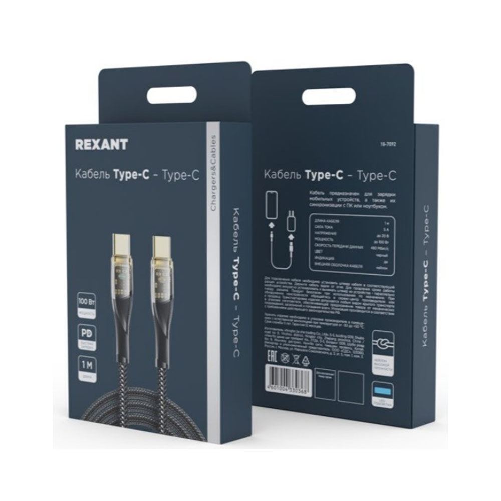 Кабель Type-C - Type-C 5А 100Вт 1 м Черный нейлон Световая индикация REXANT - предназначен для зарядки электронных устройств, а также их синхронизации с ПК или ноутбуками. С двух сторон изделия расположены разъемы Type-C. Кабель выполнен из нейлонового плетеного провода высокой плотности, что защищает от перегибов и заломов. Предусмотрена световая индикация, которая облегчает использование устройства в темное время суток. Кабель поддерживает стандарт быстрой зарядки Power Delivery и имеет выходную мощность 100 Вт с силой тока 5 А. Длина кабеля равна 1 м.