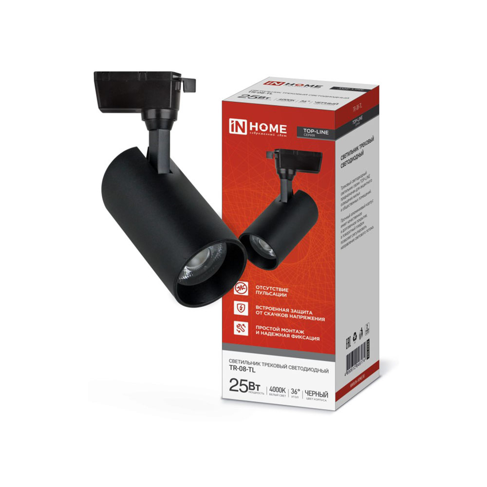 Светильник трековый светодиодный TR-08-TL 25Вт 4000К 2500Лм IP40 36° Черный TOP-LINE IN HOME - используется для общего и локального освещения внутри помещений различного типа. Светильник устанавливается на шинопровод, может перемещаться вдоль трека, изменяя направление освещения и концентрируя световые потоки в нужной точке. Угол вращения - 360°. Угол рассеяния - 36°.