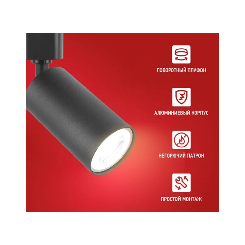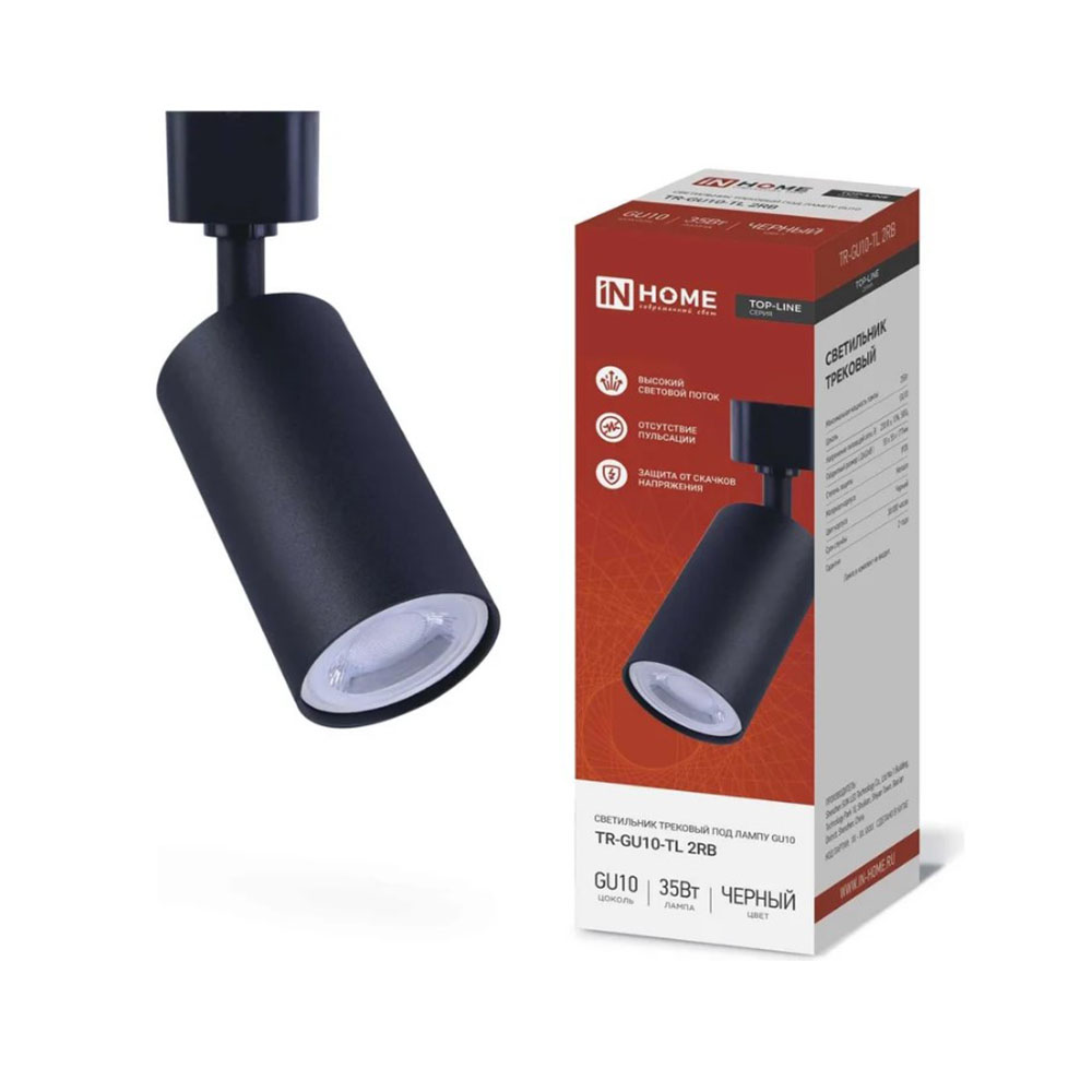 Светильник трековый TR-GU10-TL 2RB под лампу GU10 Черный IN HOME - компактный трековый светильник TR-GU10-TL серии TOP-LINE с удобным поворотным механизмом предназначен под лампу с цоколем GU10 мощностью до 35Вт. Светильник устанавливается на шинопровод, может перемещаться вдоль трека, изменяя направление освещения и концентрируя световой поток в нужной точке. Используется для общего и акцентного освещения помещений, подсветки витрин. Угол вращения вокруг вертикальной оси 90°, вокруг горизонтальной оси 360°.