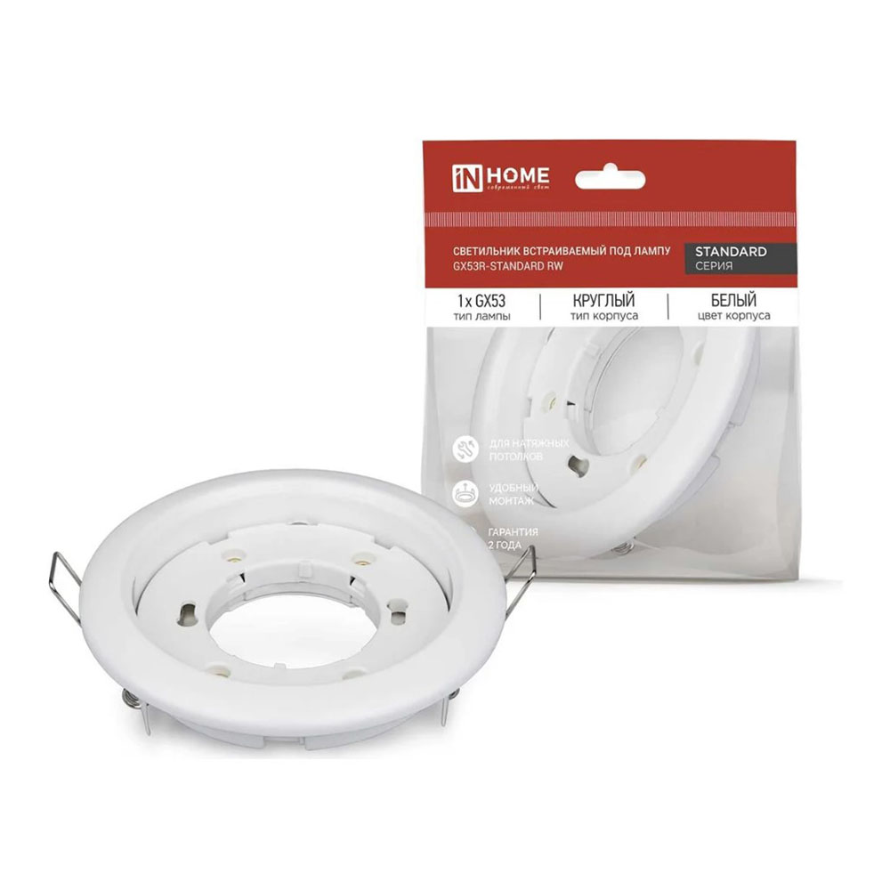 Светильник GX53R-standard RWM без лампы Белый IN HOME - предназначен для работы со светодиодными лампами GX53 мощностью от 2 Вт до 13 Вт с цветовой температурой от 2700 К до 6400 К. Станет отличной заменой точечных светильников под зеркальные и галогенные лампы рефлекторного типа. Экономит до 50% электроэнергии. Может использоваться для освещения жилых и общественных помещений, офисных зданий, торговых комплексов, отелей, кафе, ресторанов и т.д. Подходит для основных и вспомогательных мест общего пользования: коридоры, лестничные пролеты, столовые, конференц-залы, спортзалы и др. Предназначен для эксплуатации в сетях переменного тока 230 В. Идеально подходит для установки в подвесные и натяжные потолочные конструкции, а также в шкафы-купе, кухни, витрины, прилавки и пр. Не имеет «заднего света», что особенно важно для полупрозрачных натяжных потолков. Благодаря низкой теплоотдаче не требует дополнительной теплоизоляции.