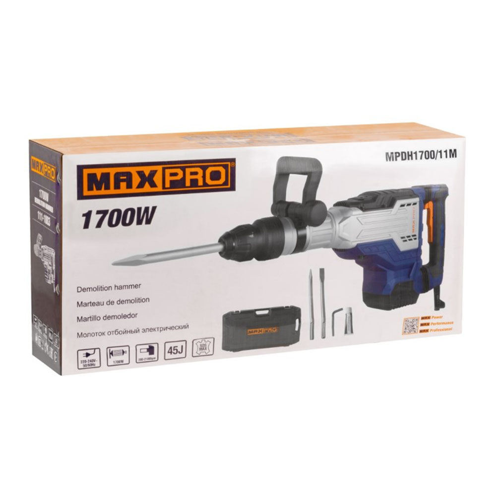 Молоток отбойный 1700 Вт 200-2100 уд/мин МАХ-PRO - разработан для работ по пробиванию отверстий в кирпичной и бетонной кладке. Имеет прочный и надежный корпус, удобную обрезиненную рукоять. Поставляется в кейсе для удобства хранения и транспортировки.