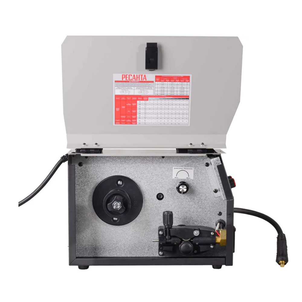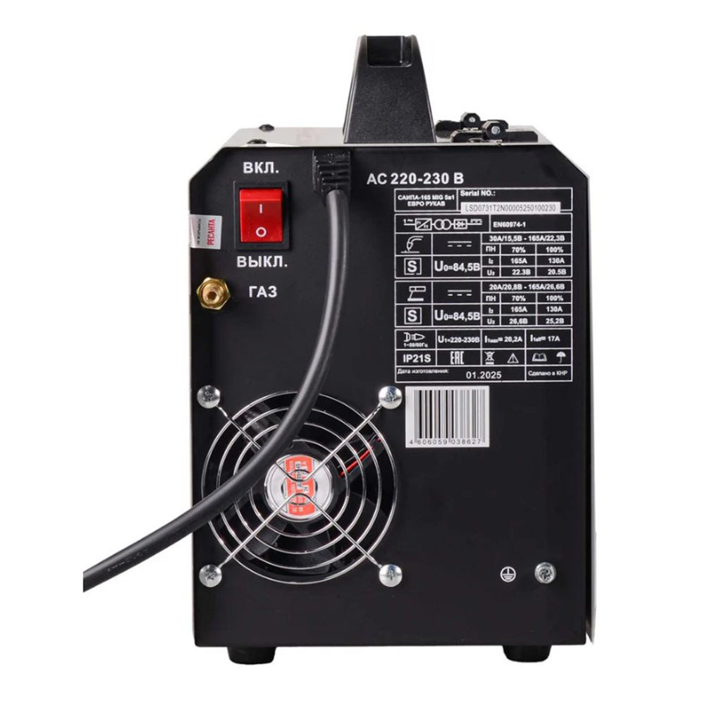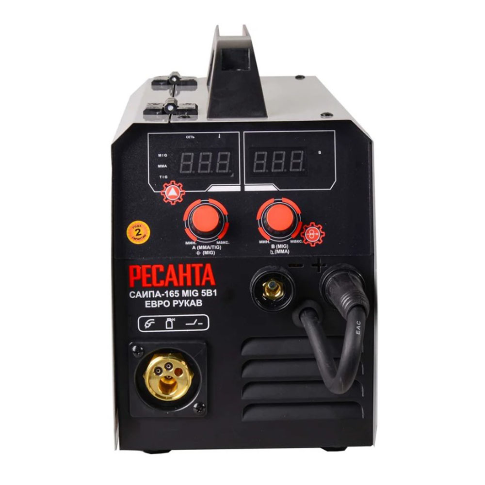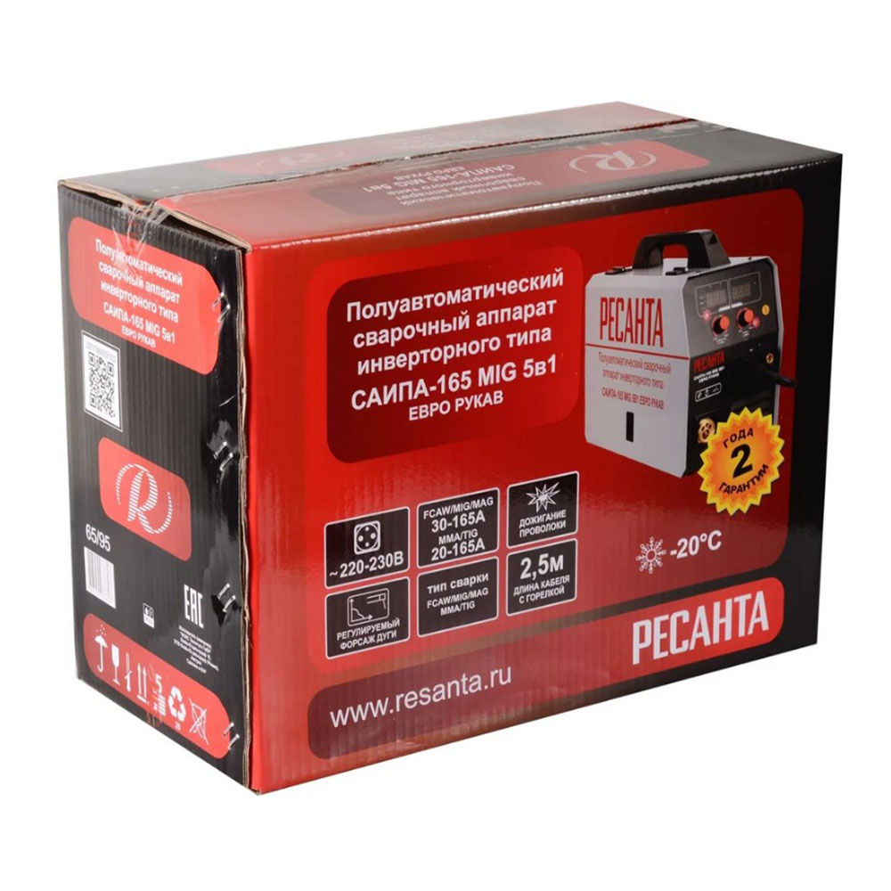 Сварочный полуавтомат САИПА-165 ЕВРО РУКАВ MIG/MAG Ресанта 65/95 - Сварочный полуавтоматический инверторный аппарат предназначен для сварки MIG/MAG и MMA. Модель Ресанта САИПА 165 Евро рукав работает от электросети 230±10% В. Полуавтоматический режим проволокой толщиной 0,6/0,8 мм в среде защитных газов и порошковой проволокой подходит для цветных и черных металлов небольшой толщины. Для ручной дуговой сварки используются штучные электроды с обмазкой диаметром 1,5-4 мм, а также электроды с рутиловым и основным покрытием. Функция дожигания проволоки обеспечивает правильное ее отсоединение от шва. Модель Ресанта САИПА 165 Евро рукав имеет встроенную катушку массой до 5 кг. Рабочий цикл при максимальном сварочном токе равен 70%. Класс изоляции F определяет устойчивость к перегреву до +155° C во время работы. Прибор может эксплуатироваться при температуре от -20° до +50° C. В комплектацию входит съемная горелка MIG длиной 2 м, ролик для подачи проволоки, наконечники и кабель заземления. Портативный сварочный аппарат универсален в эксплуатации. Компактные габариты и малый вес обеспечивают мобильность при бытовом использовании. На задней панели расположены штуцер для подключения газового рукава, кнопка включения/выключения, таблица настроек полуавтомата, кабель питания и охлаждающий вентилятор. На лицевой панели имеется кнопка протяжки проволоки, индикаторы сети и перегрева, тумблер переключения режимов сварки, механический регулятор тока.