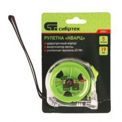 Рулетка Сибртех Кварц 5 м*19 мм - это простой в использовании измерительный инструмент. Прочный прозрачный корпус изготовлен из поликарбоната. Стальная лента имеет длину 5 метров и оснащена подвижным зацепом на конце. Амортизатор защищает рулетку от повреждений при быстром возврате ленты.
