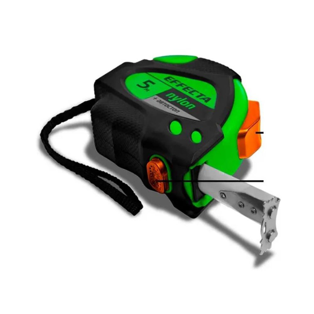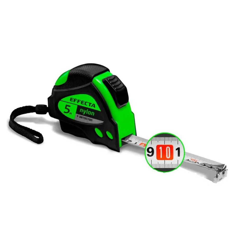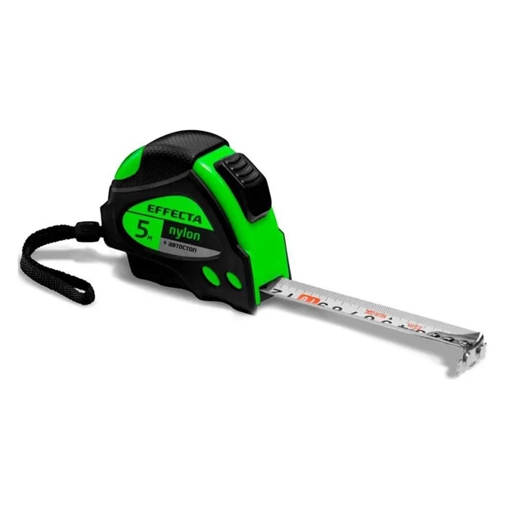 Рулетка 5 м 19 мм с магнитом EFFECTA Nylon - обрезиненный корпус рулетки Effecta Nylon выполнен из ударопрочного ABS-пластика, который позволяет не волноваться за сохранность, если инструмент упадет во время работы. Особенностью данной рулетки является намагниченный наконечник полотна. Он легко фиксируется на объекте измерения. На ленту нанесено нейлоновое покрытие, что значительно продлевает срок эксплуатации инструмента. Рулетка оснащена механизмом автоматического стопора, который делает процесс измерений проще и точнее. Автоматическое сматывание рулетки осуществляется посредством нажатия одной из двух кнопок-стопоров. Лента - 5м х 19мм. Большая длина ленты помогает справляться практически с любыми задачами, а увеличенная ширина полотна дает возможность работать с инструментом на небольших расстояниях без посторонней помощи - лента не будет изламываться. Для удобства хранения и транспортировки инструмент оснащен специальным ремешком для ношения на руке и поясным креплением.