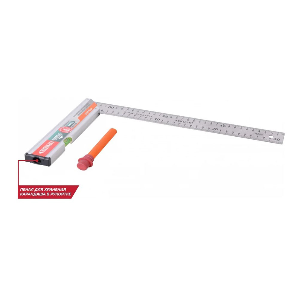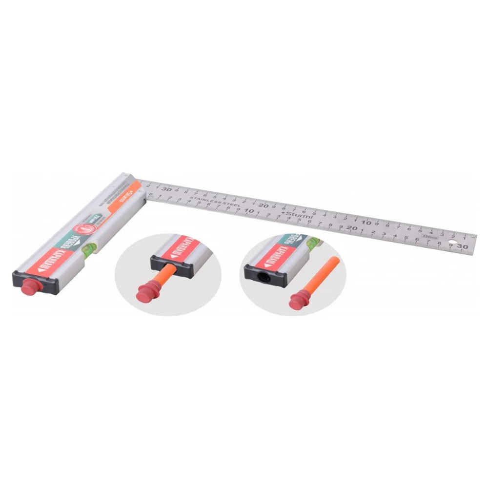 Угольник с уровнем и карандашом КУЛИБИН 350 мм Sturm - уникальная запатентованная система позволяет хранить карандаш прямо в корпусе угольника, благодаря чему он будет всегда под рукой. Переход от замера к разметке и обратно стал максимально быстрым, что в разы экономит время в процессе работы. Крепление осуществляется специально разработанной резиновой втулкой, которая надёжно удерживает карандаш, а так же позволяет его быстро извлечь и вернуть на место, исключая возможную потерю. Колба пузырькового уровня из ударопрочного плексигласа, полотно из нержавеющей стали с антикоррозийным покрытием, гравированная шкала устойчива в внешнему воздействию и сохранению точных показаний.