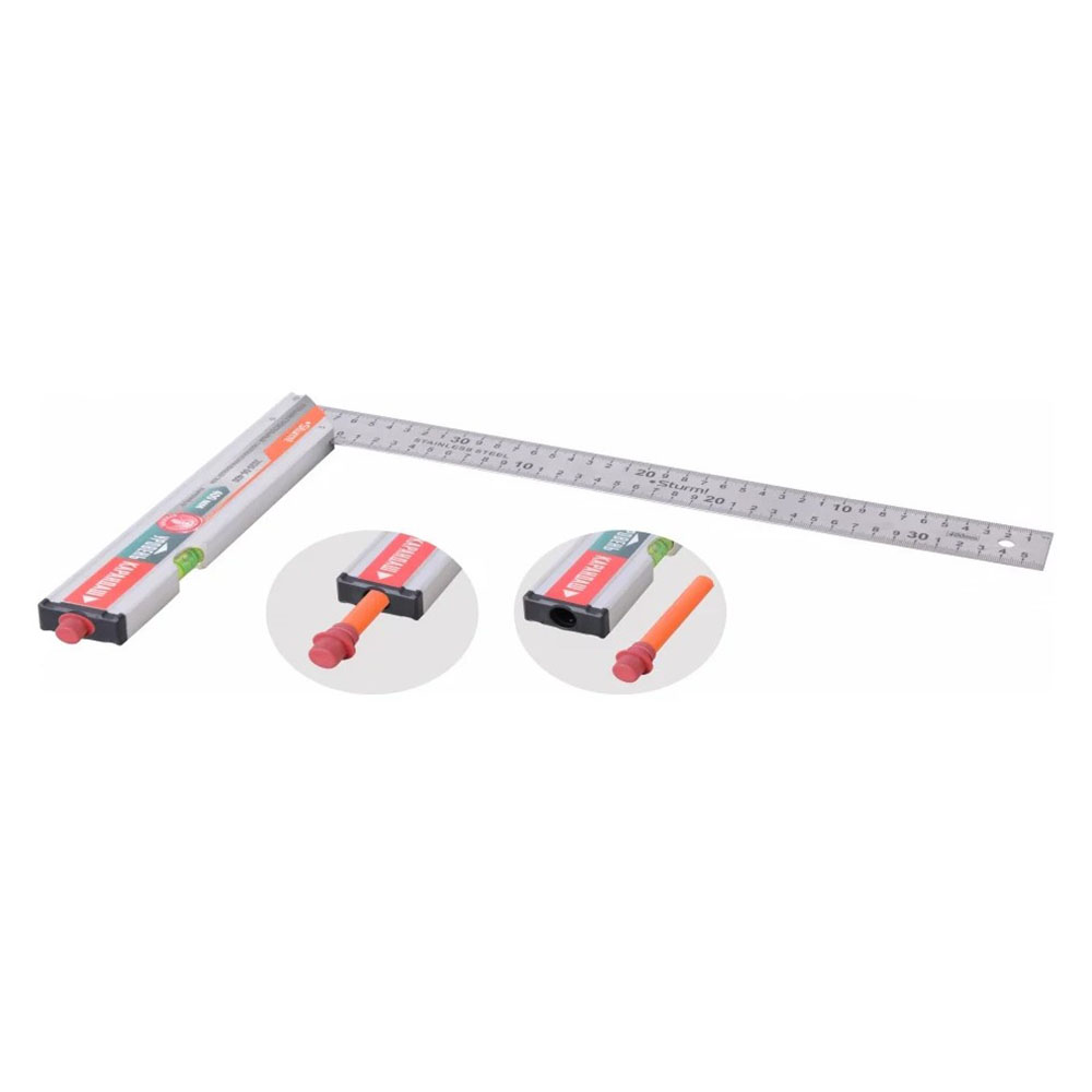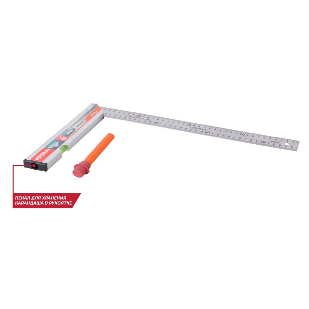 Угольник с уровнем и карандашом КУЛИБИН 400 мм Sturm - уникальная запатентованная система позволяет хранить карандаш прямо в корпусе угольника, благодаря чему он будет всегда под рукой. Переход от замера к разметке и обратно стал максимально быстрым, что в разы экономит время в процессе работы. Крепление осуществляется специально разработанной резиновой втулкой, которая надёжно удерживает карандаш, а так же позволяет его быстро извлечь и вернуть на место, исключая возможную потерю. Колба пузырькового уровня из ударопрочного плексигласа, полотно из нержавеющей стали с антикоррозийным покрытием, гравированная шкала устойчива в внешнему воздействию и сохранению точных показаний.