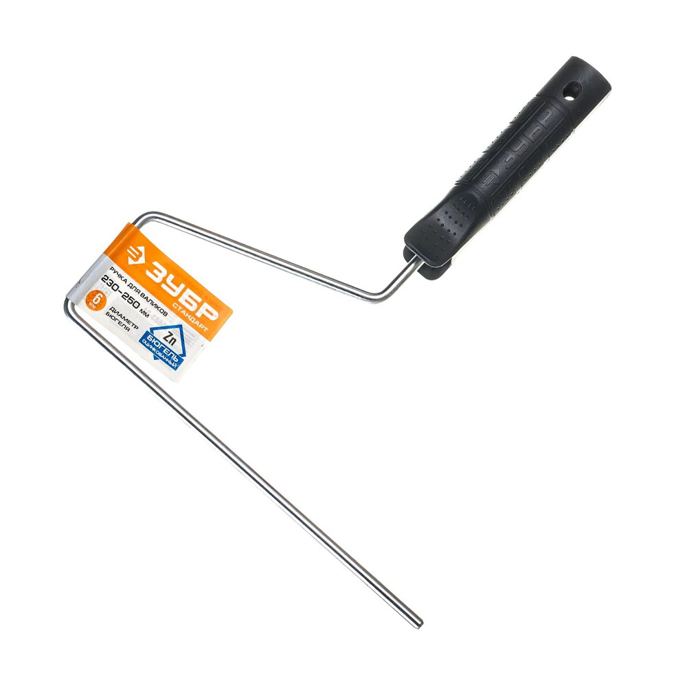 Рукоятка бюгель для валиков 6х230-250 мм ЗУБР - применяется совместно с малярными валиками при проведении отделочных работ. Рукоятка выполнена из высокопрочного пластика. Стержень ручки оцинкован, что обеспечивает защиту от коррозии. Возможно использование со стандартными телескопическими стержнями конической формы (с фиксатором и без фиксатора).