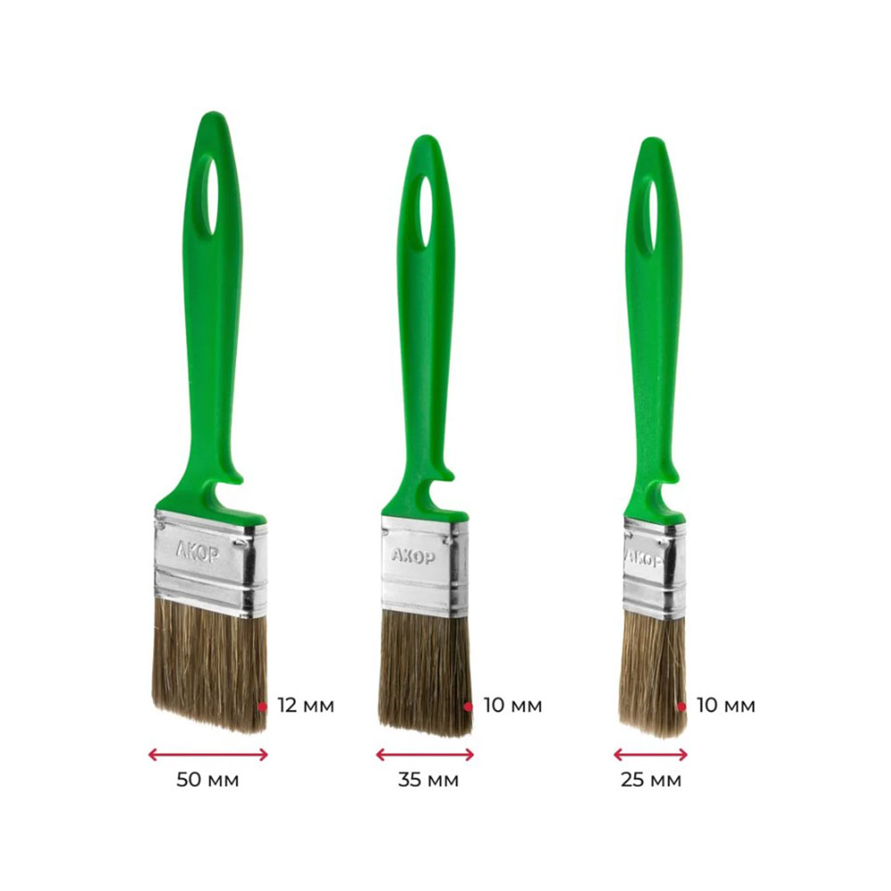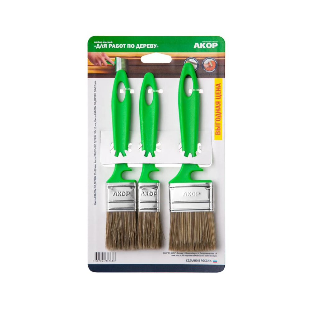 Набор кистей по дереву 3 шт АКОР - малярные плоские кисти для дерева серии «Эксперт». Рабочая часть кистей состоит из набора синтетических волокон. В состав набора входят 3 кисти разного размера. Ручка имеет выемку для крепления на емкость с краской, благодаря которой кисть не упадёт и не испачкает поверхность во время перерыва в работе. Кисти обеспечивают гладкий и равномерный выкрас. Подходят для окраски фанеры, вагонки, ДВП, ДСП, текстурной бумаги, блок-хауса, шпона, пропитанной или термообработанной древесины и других деревянных поверхностей, в том числе предварительно окрашенных. Предназначены для окрашивания деревянной мебели, дверей, оконных рам, заборов, стен, полов, перил, садовых строений, оград, террас, беседок и других деревянных объектов.