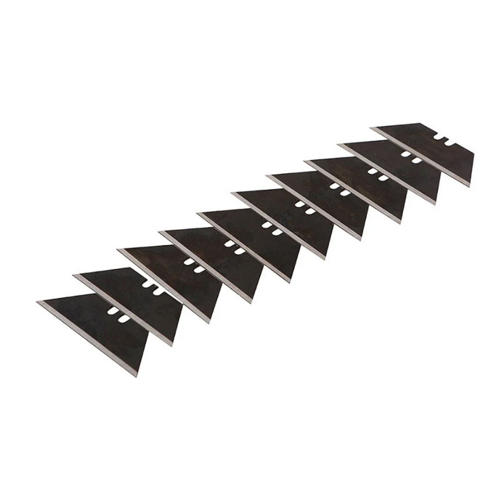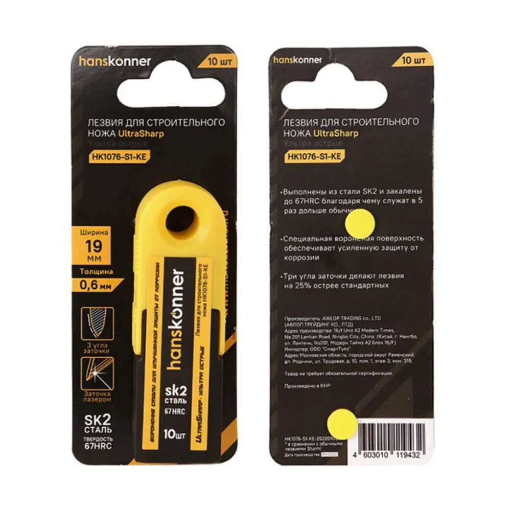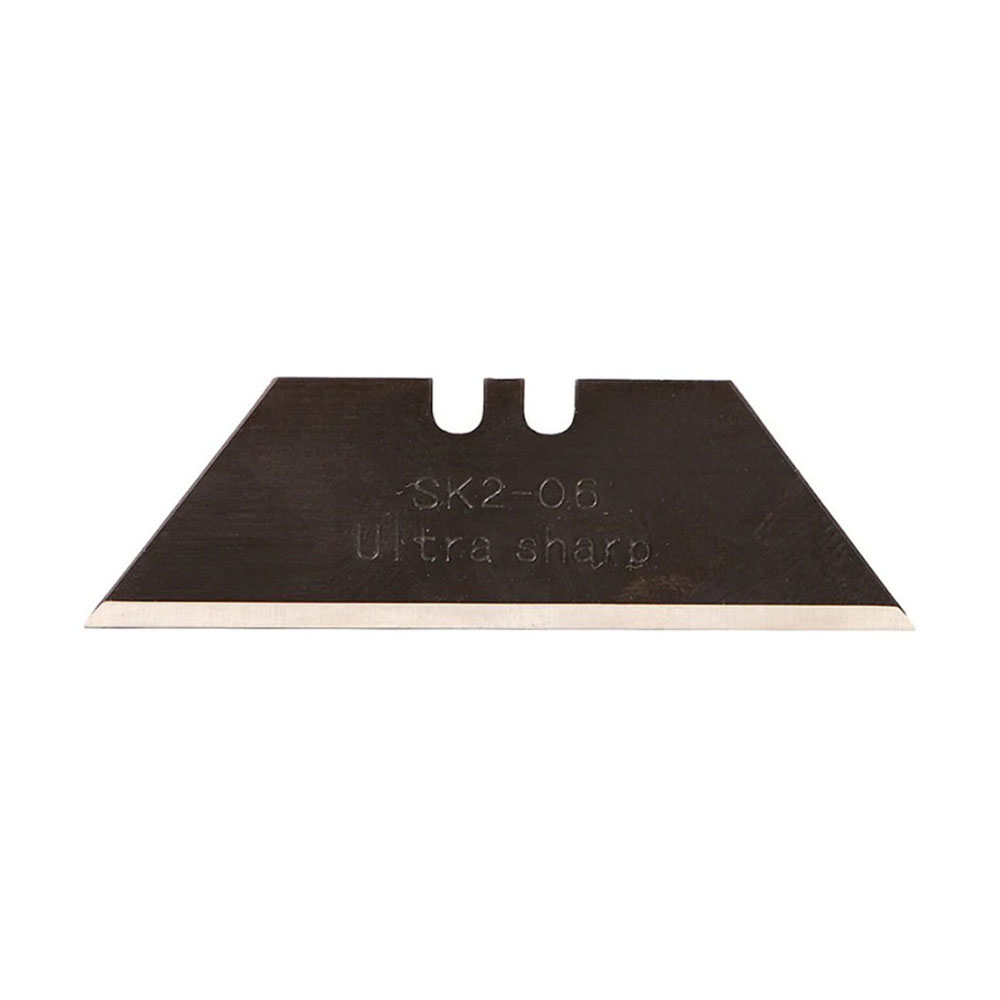 Лезвия трапеция 10шт/уп Hanskonner - удобный закрывающийся кейс с откидывающейся крышкой позволяет не только безопасно хранить лезвия, но и быстро получить к ним доступ при необходимости. Специальная вороненая поверхность лезвий обеспечивает усиленную защиту от коррозии. Выполнены из стали SK2 и дополнительно заточены лазером для достижения твёрдости 67 HRC, благодаря чему служат в пять раз дольше стандартных. Три угла заточки делают лезвия на 25% острее стандартных, что позволяет прикладывать меньше усилий при эксплуатации.