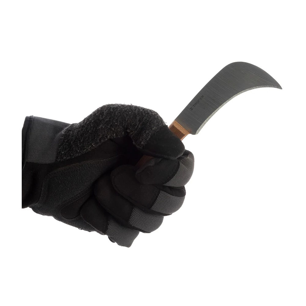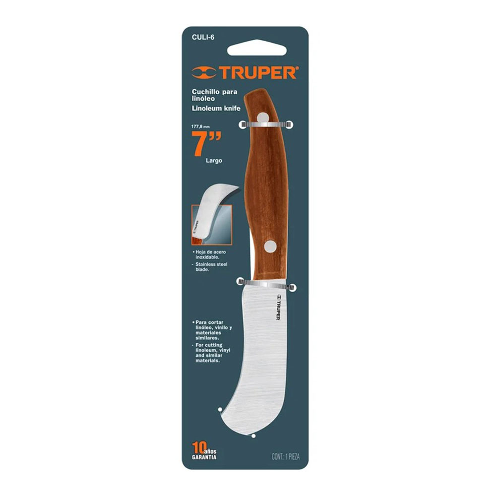 Нож для линолеума 150 мм Truper CULI-6 - это ручной инструмент, который используется для вспомогательных работ при выполнении ремонта в помещениях и пр. Нож имеет изогнутую форму лезвия, которая облегчает резку разнообразных материалов, например, кожи или линолеума. Благодаря эргономичной рукоятке изделие удобно лежит в руке в процессе работы.