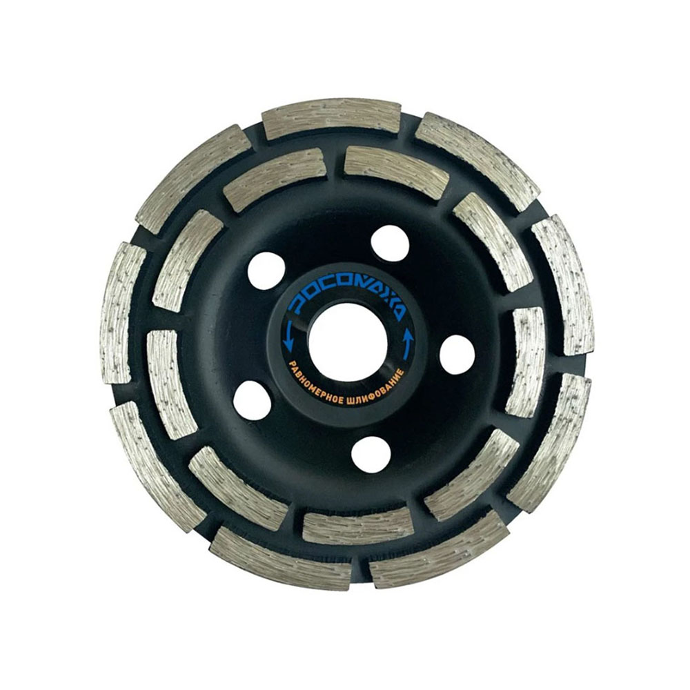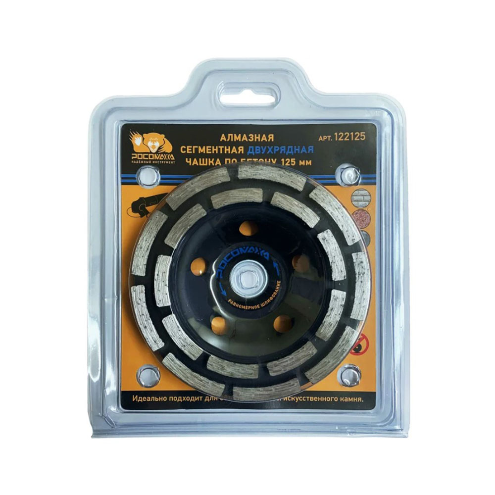 Чашка алмазная 125 мм двухрядная Росомаха - применяется для зачистки, выравнивания, снятия краски и шлифования поверхностей из бетона, гранита, природного и искусственного камня. Сегменты, расположенные в два ряда, отлично подходят для равномерного шлифования бетона.