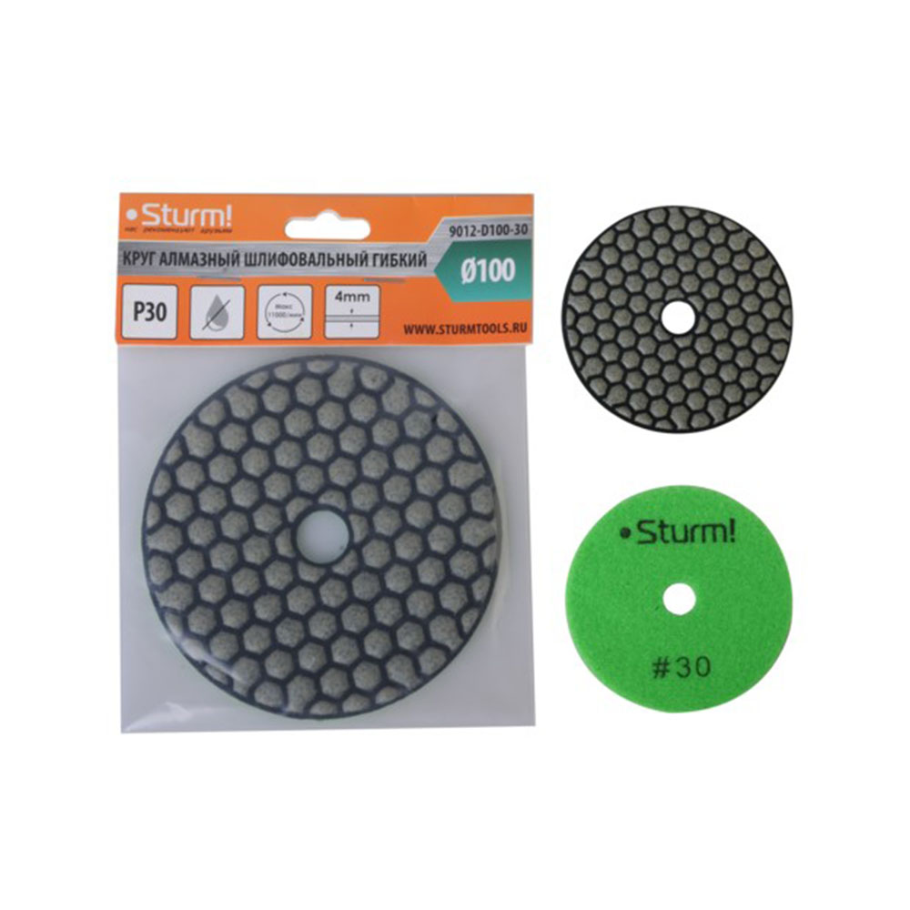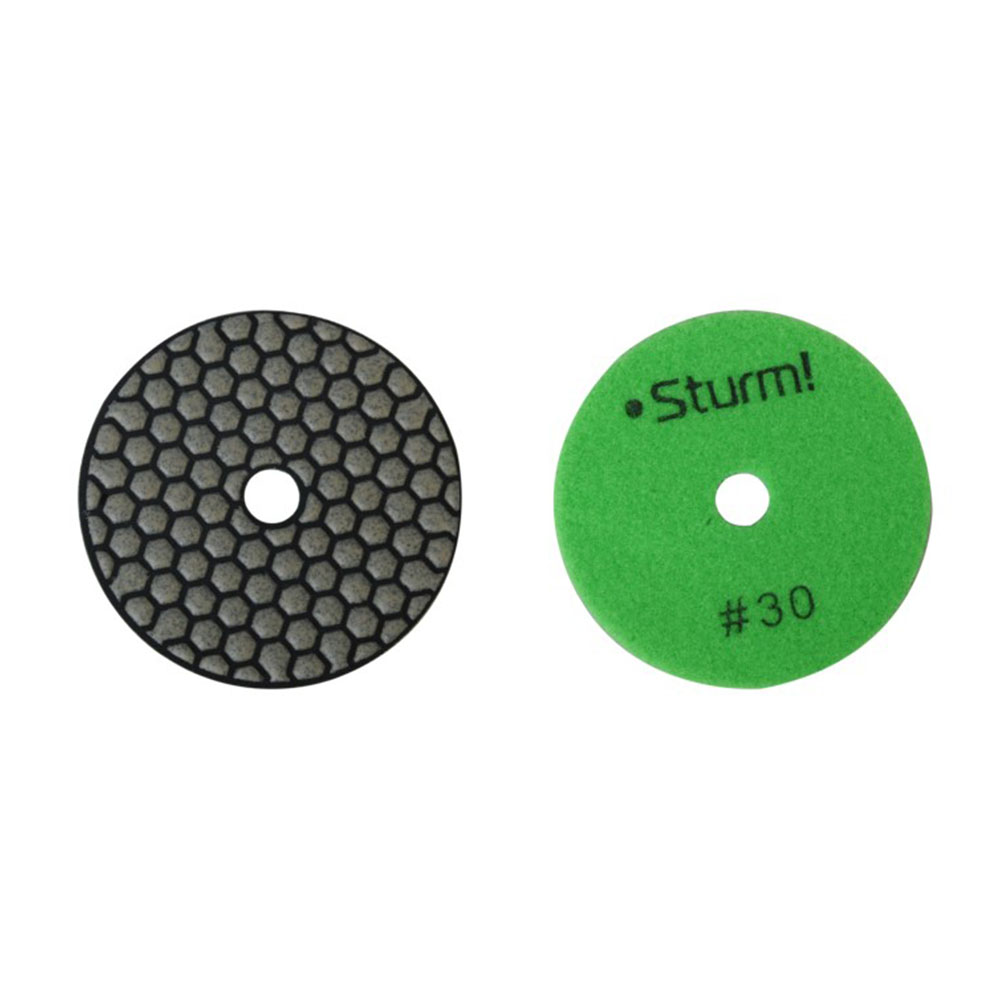 Алмазный шлифовальный круг 100 мм Зернистость 30 Sturm - предназначен для полировальных и шлифовальных машин. Применяется для сухой полировки гранита, мрамора, керамогранита. Высокое качество связки и синтетического алмазного порошка гарантирует длительное использование, а также постепенное равномерное снятие слоя шлифуемого материала, а на выходе ровную поверхность без царапин.