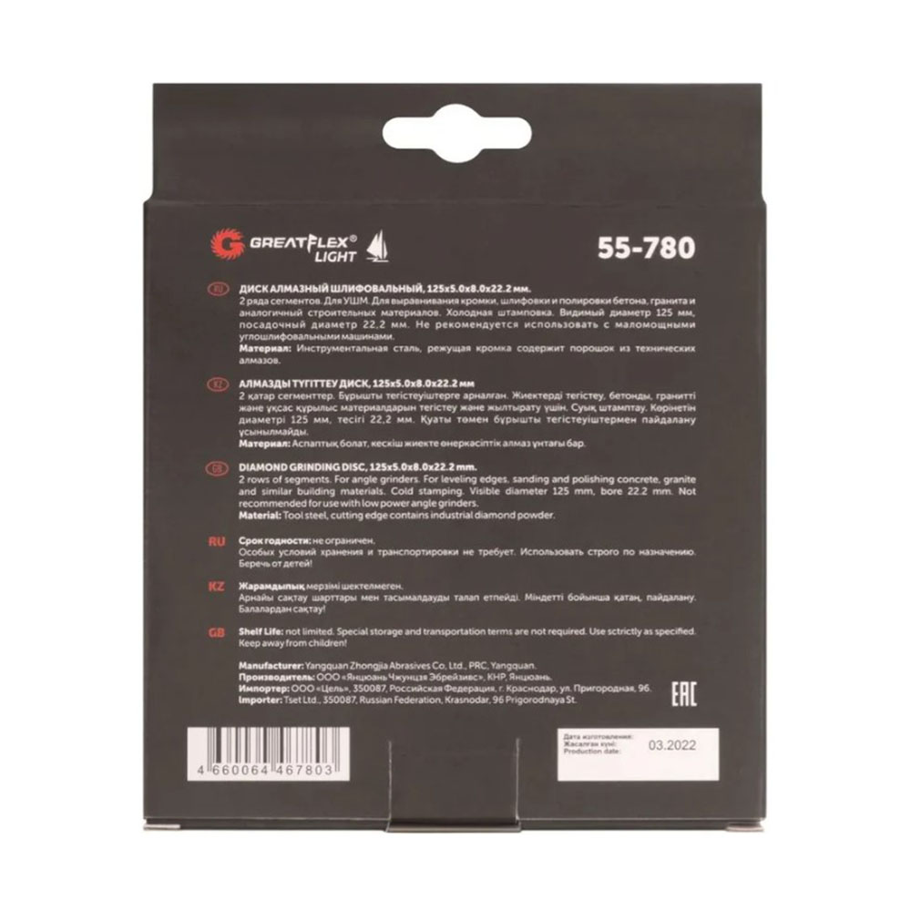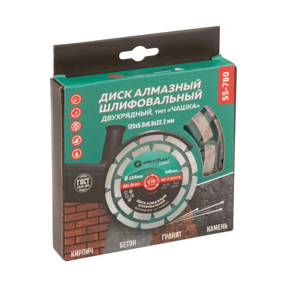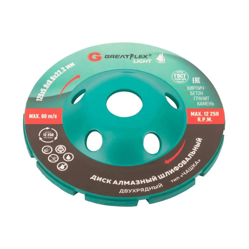 Чашка алмазная двухрядная 125 мм GREAT FLEX LIGHT - для работы по камню, кирпичу, бетону и аналогичным строительным материалам с помощью УШМ. Для сухой и влажной работы. Материал: высокоуглеродистая сталь, технические алмазы. Холодная штамповка.