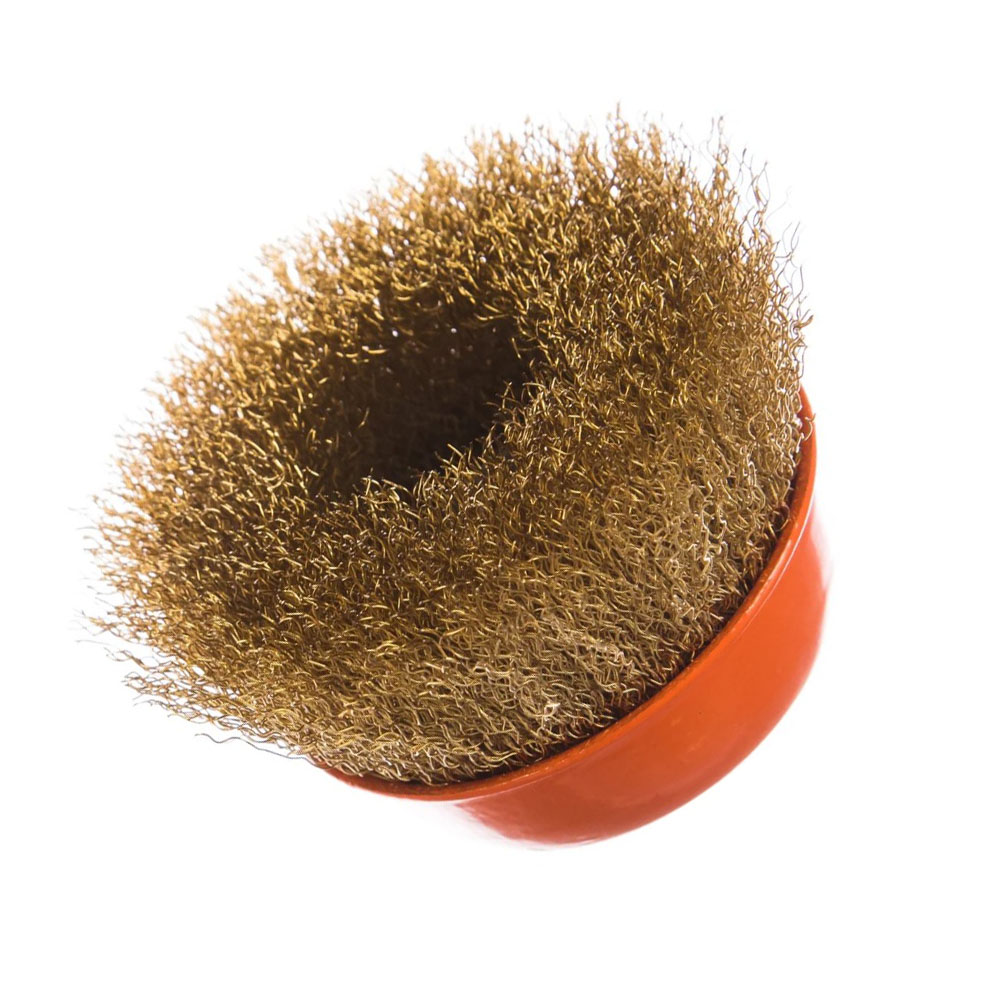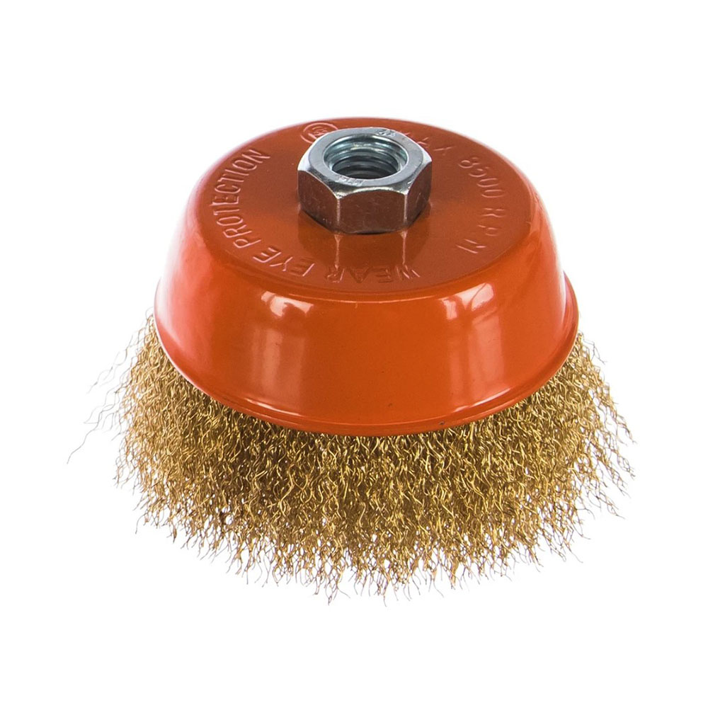 Щетка чашка для УШМ 100 мм Желтая Sturm - является сменным элементом для угловых шлифовальных машин. Применяется для шлифовки, полирования, зачистки от лака, краски и коррозии различных поверхностей и изделий. Рабочая часть состоит из волнистой стальной проволоки с латунным покрытием.