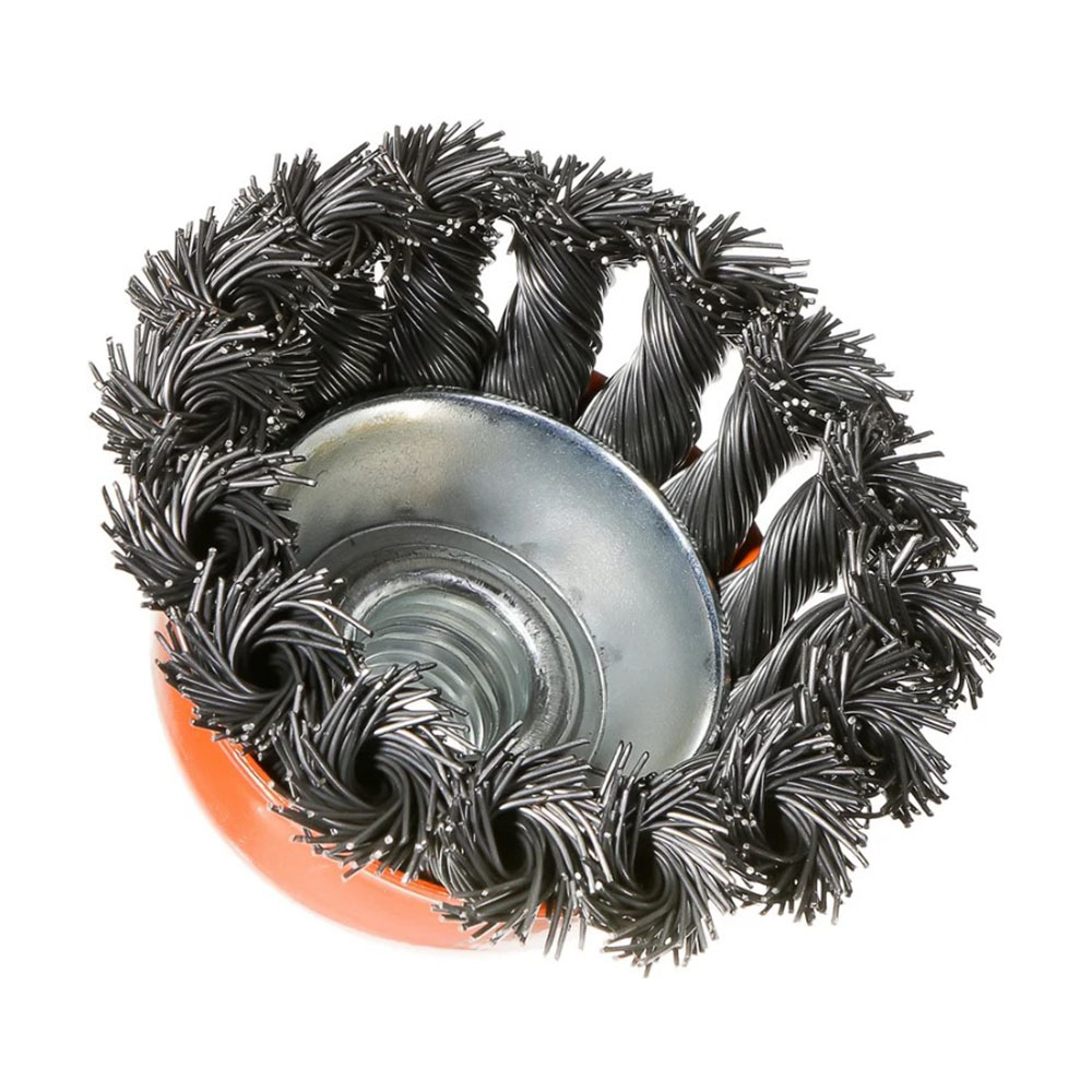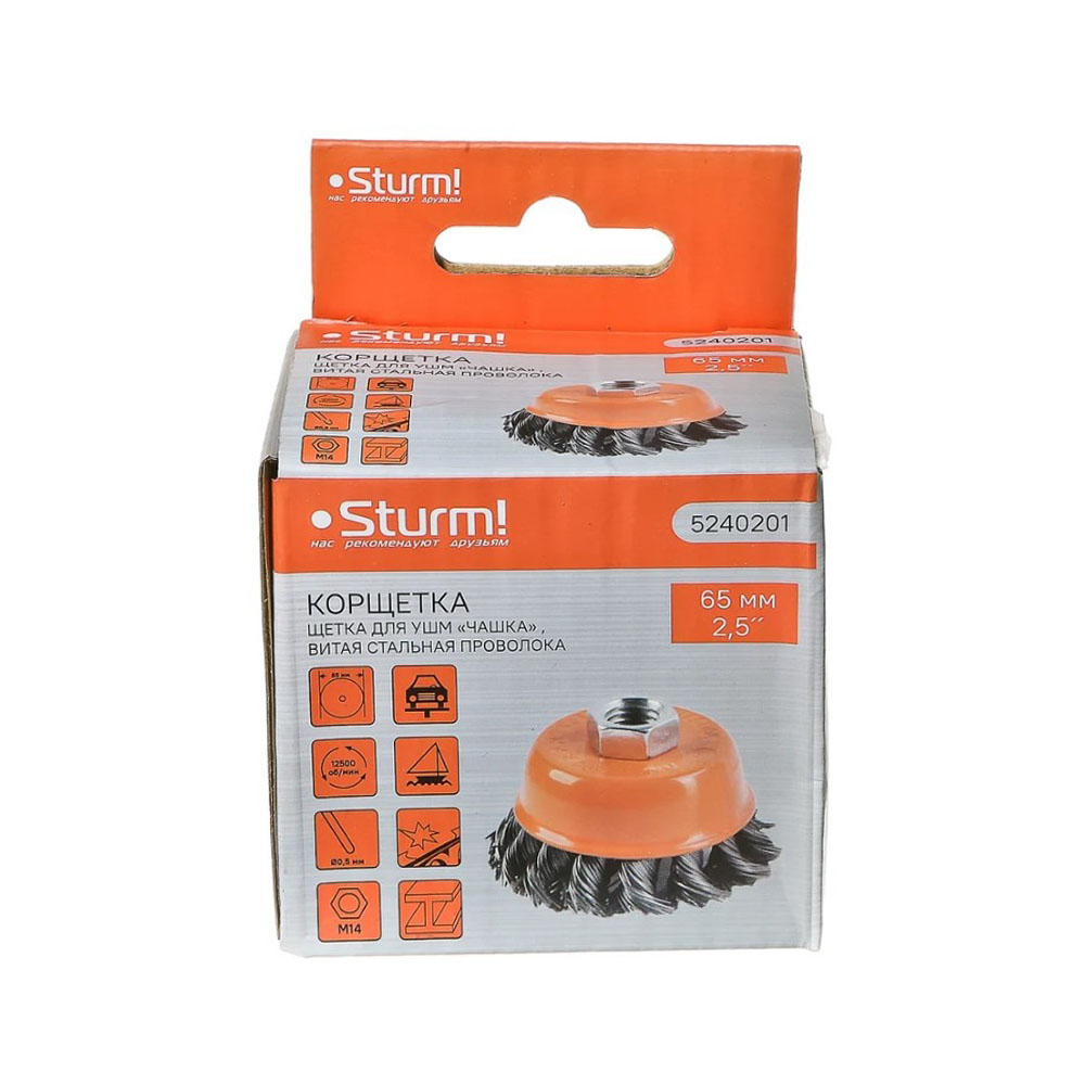Щетка чашка для УШМ 65 мм Витая Sturm - применяется совместно с угловыми шлифовальными машинами и предназначена для снятия лака, краски, зачистки от ржавчины металлических поверхностей и изделий. Рабочая часть состоит из скрученной в пучки стальной проволоки. Максимальная скорость вращения – 12500 об/мин.