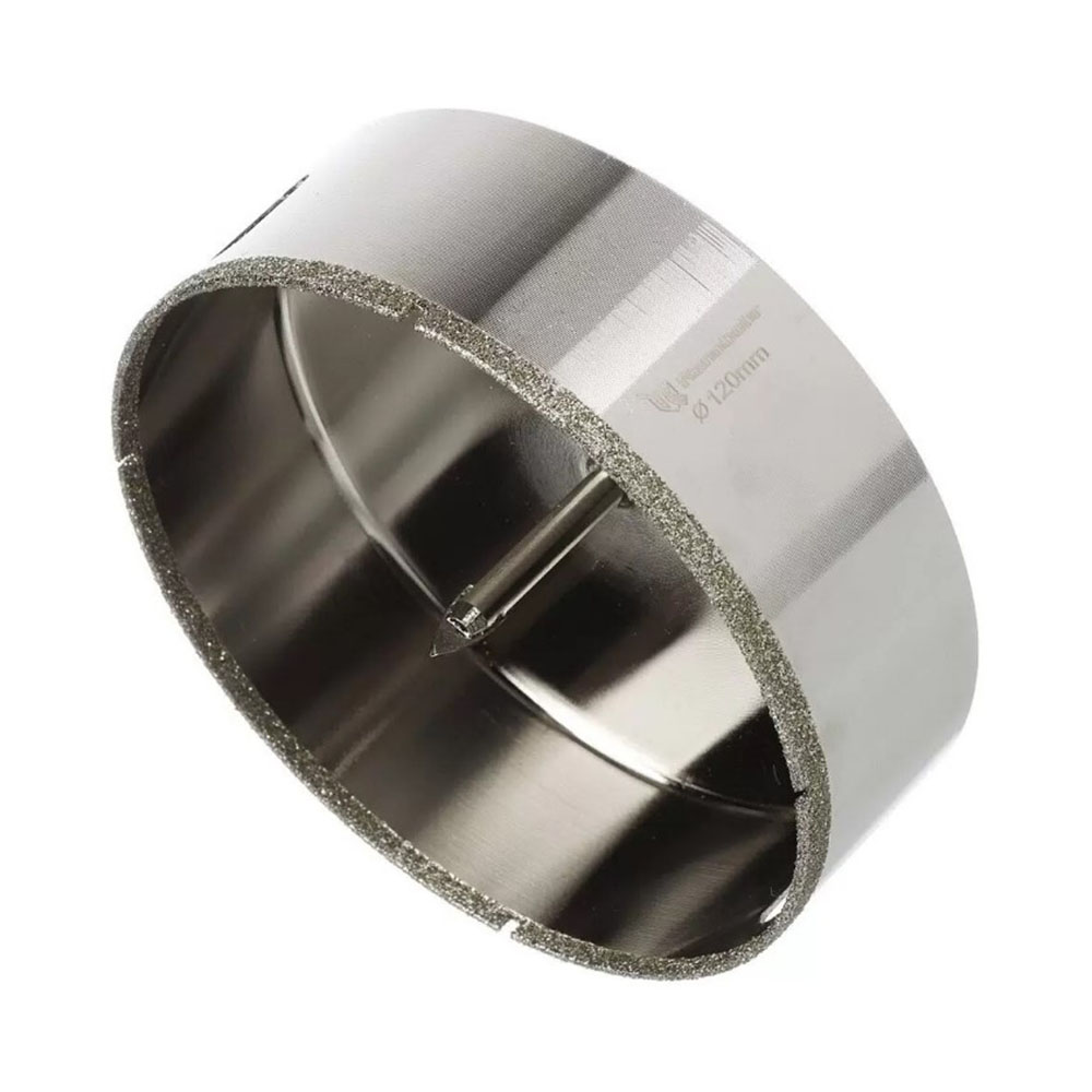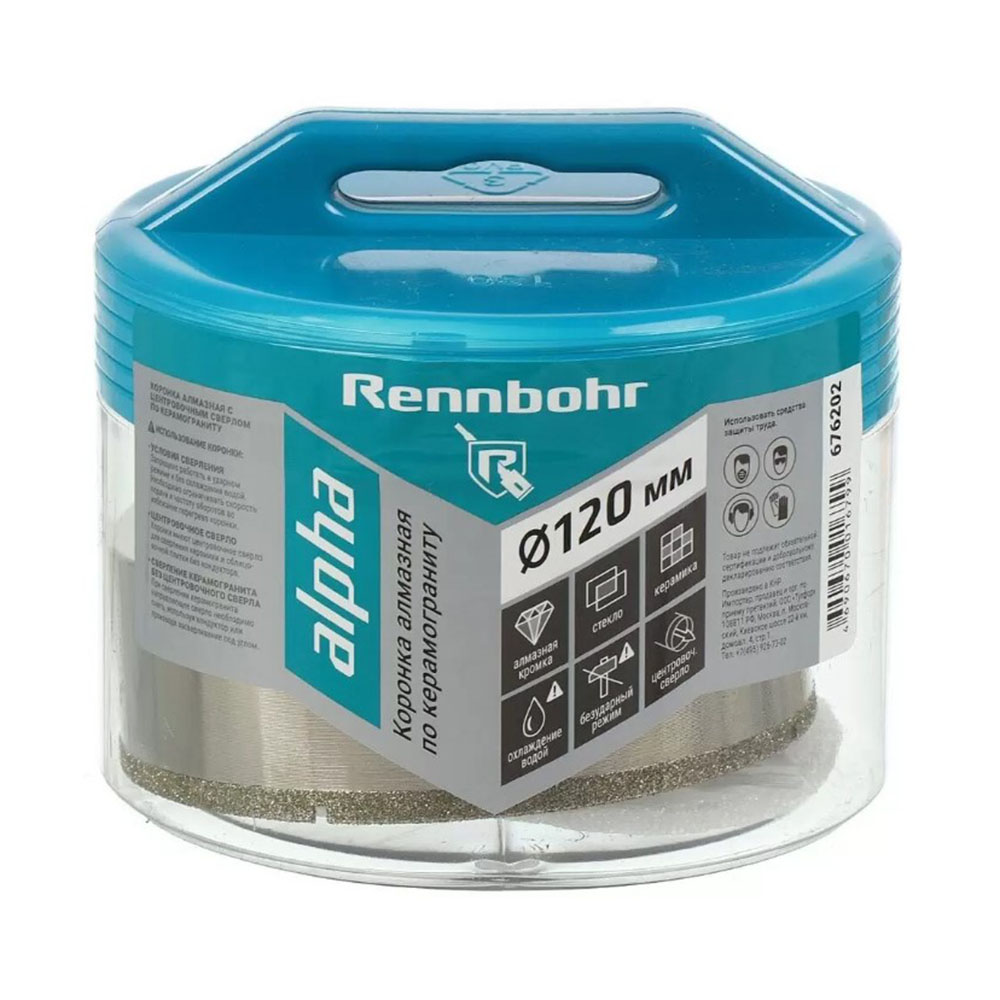 Коронка алмазная 120 мм по керамограниту Rennbohr - предназначена для обработки керамогранита, керамической плитки, изделий из керамики. Тонкая режущая кромка для быстрого и чистого сверления. Алмазное покрытие и перфорированный наконечник обеспечивает долгий срок службы при обработке самой твердой керамической плитки и керамогранита. Коронка имеет направляющее твердосплавное сверло для точного сверления без отклонений. Запрещено работать в ударном режиме и без охлаждения водой, а так же рекомендуется ограничивать скорость подачи и частоту оборотов, чтобы избежать перегрева.