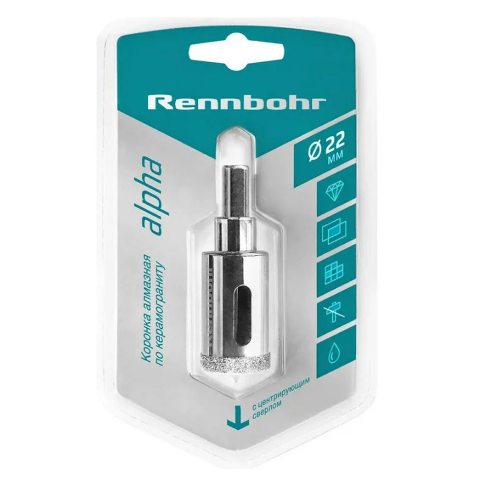 Коронка алмазная 22 мм по керамограниту Rennbohr - предназначена для обработки керамогранита, керамической плитки, изделий из керамики. Тонкая режущая кромка для быстрого и чистого сверления. Алмазное покрытие и перфорированный наконечник обеспечивает долгий срок службы при обработке самой твердой керамической плитки и керамогранита. Коронка имеет направляющее твердосплавное сверло для точного сверления без отклонений. Запрещено работать в ударном режиме и без охлаждения водой, а так же рекомендуется ограничивать скорость подачи и частоту оборотов, чтобы избежать перегрева.