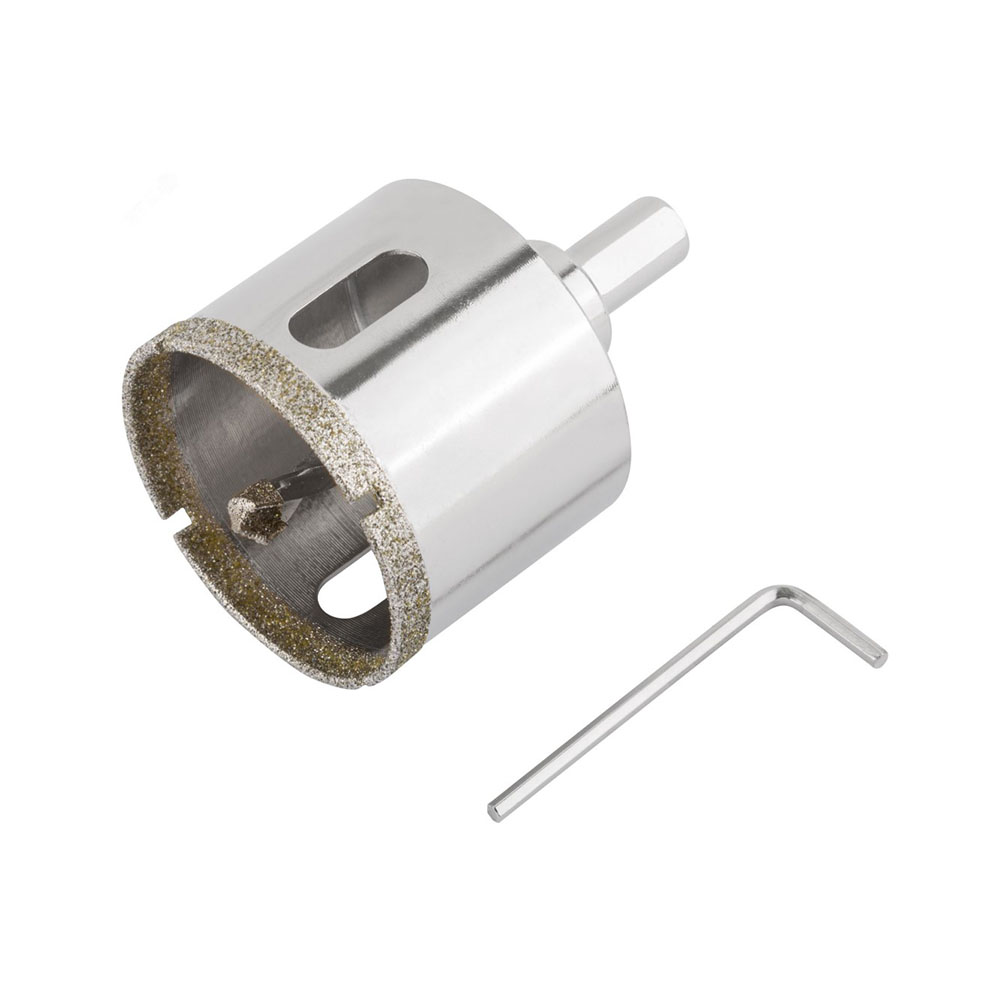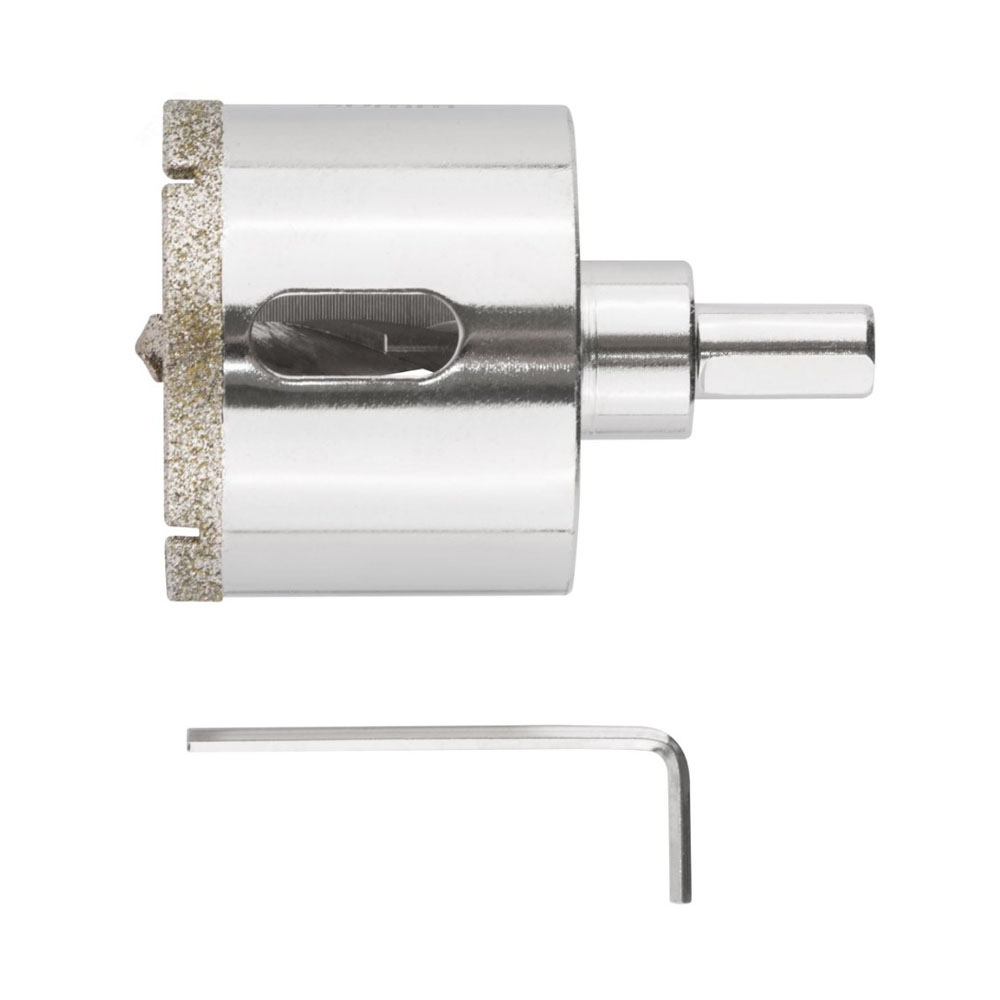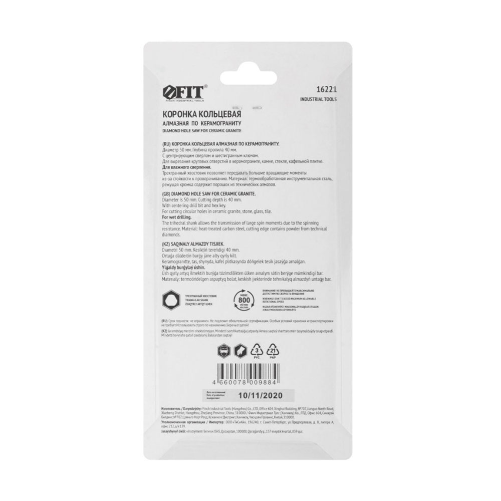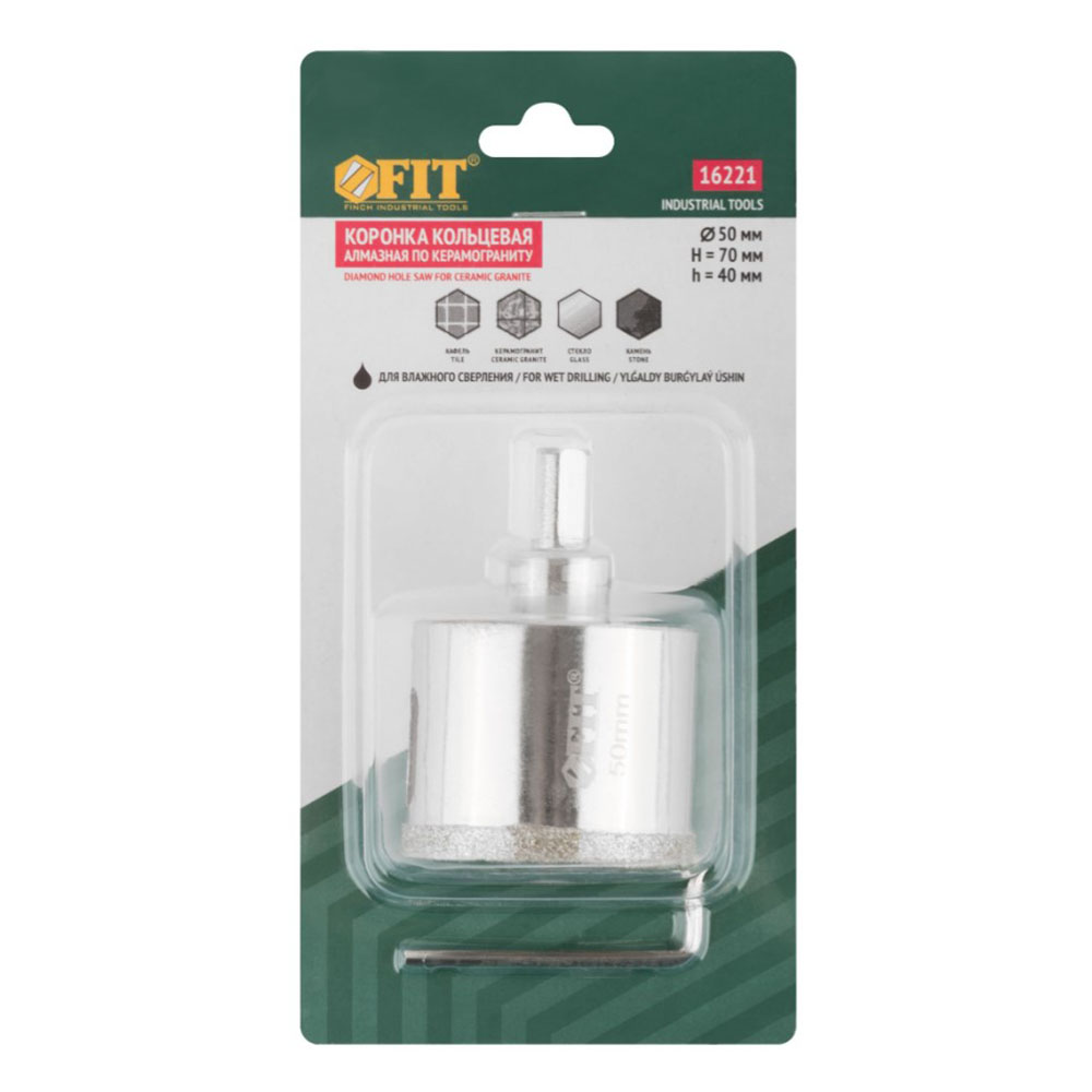 Коронка по керамограниту 50х70 мм FIT - предназначена для вырезания круглых отверстий в керамограните, камне, стекле, кафельной плитке. Поставляются в комплекте с центрирующим сверлом и шестигранным ключом. Влажное сверление. Высокая концентрация алмазного зерна обеспечивает износостойкость и длительный ресурс коронок. Чистый рез без сколов достигается за счет мелкого размера алмазных частиц. Центрирующее сверло предотвращает смещение коронки во время работы и способствует точному позиционированию. Трехгранный хвостовик передает больший крутящий момент за счет стойкости к проворачиванию.