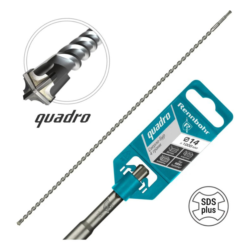 Бур 14х1000 мм SDS-plus 4 грани RENNBOHR Quadro - предназначен для сверления отверстий в бетоне (в т.ч. армированном), кирпиче, граните, клинкере, а также искусственном и натуральном камне. Буры RENNBOHR QUADRO изготовлены из высококачественной инструментальной стали 40Cr, оснащены твердосплавной пластиной с центрирующим острием и четырьмя режущими кромками, что обеспечивает максимальную производительность и износостойкость.