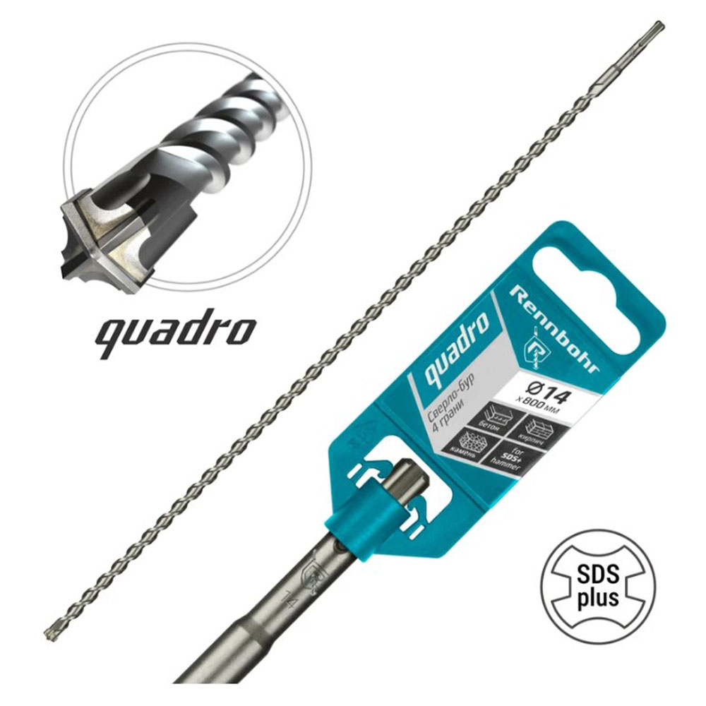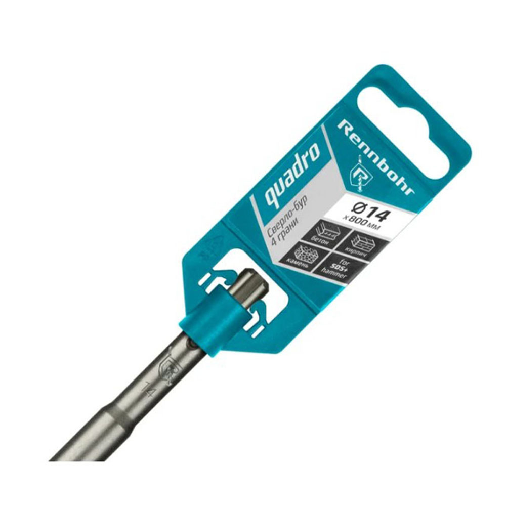 Бур 14х800 мм SDS-plus 4 грани RENNBOHR Quadro - предназначен для сверления отверстий в бетоне (в т.ч. армированном), кирпиче, граните, клинкере, а также искусственном и натуральном камне. Буры RENNBOHR QUADRO изготовлены из высококачественной инструментальной стали 40Cr, оснащены твердосплавной пластиной с центрирующим острием и четырьмя режущими кромками, что обеспечивает максимальную производительность и износостойкость.