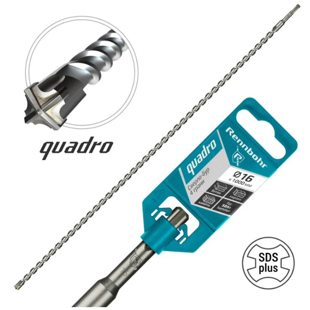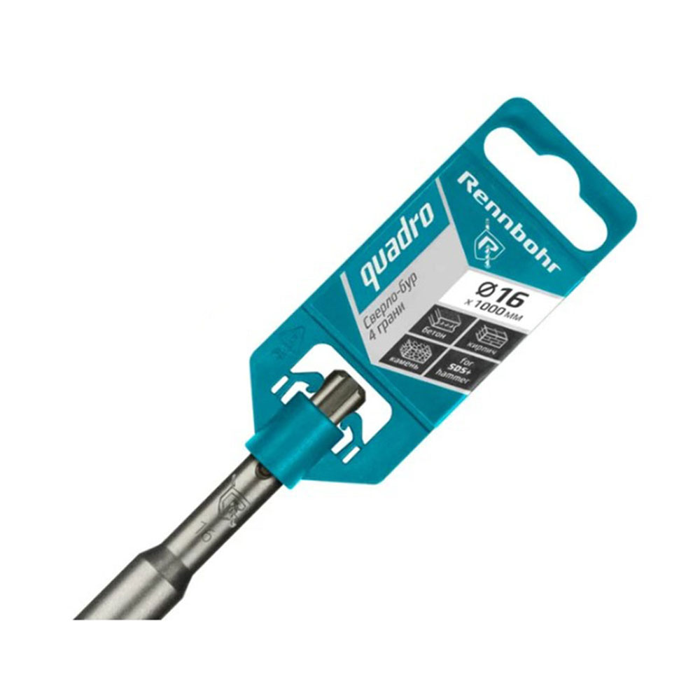 Бур 16х1000 мм SDS-plus 4 грани RENNBOHR Quadro - предназначен для сверления отверстий в бетоне (в т.ч. армированном), кирпиче, граните, клинкере, а также искусственном и натуральном камне. Буры RENNBOHR QUADRO изготовлены из высококачественной инструментальной стали 40Cr, оснащены твердосплавной пластиной с центрирующим острием и четырьмя режущими кромками, что обеспечивает максимальную производительность и износостойкость.