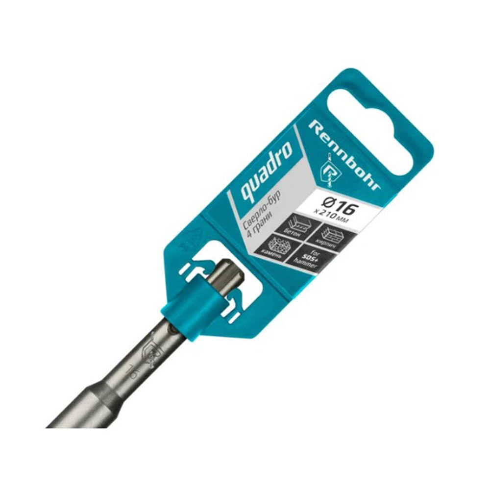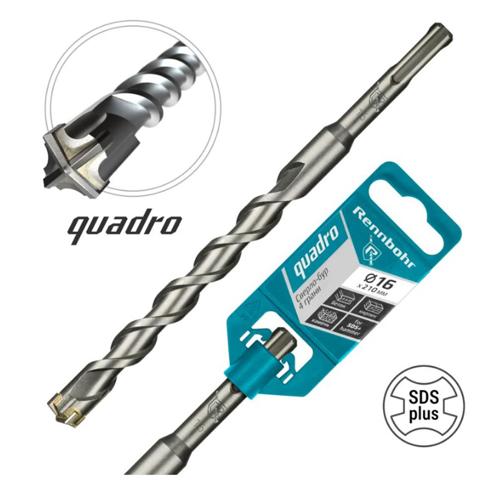 Бур 16х210 мм SDS-plus 4 грани RENNBOHR Quadro - предназначен для сверления отверстий в бетоне (в т.ч. армированном), кирпиче, граните, клинкере, а также искусственном и натуральном камне. Буры RENNBOHR QUADRO изготовлены из высококачественной инструментальной стали 40Cr, оснащены твердосплавной пластиной с центрирующим острием и четырьмя режущими кромками, что обеспечивает максимальную производительность и износостойкость.