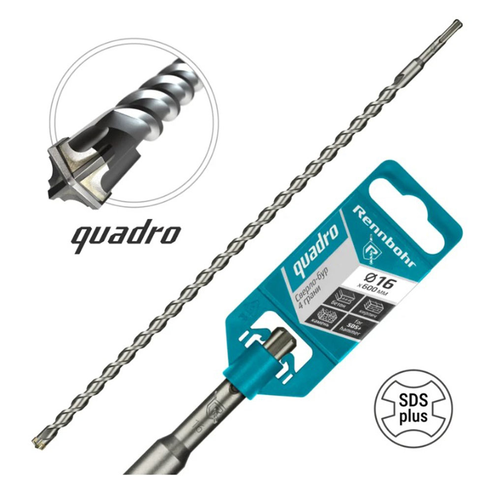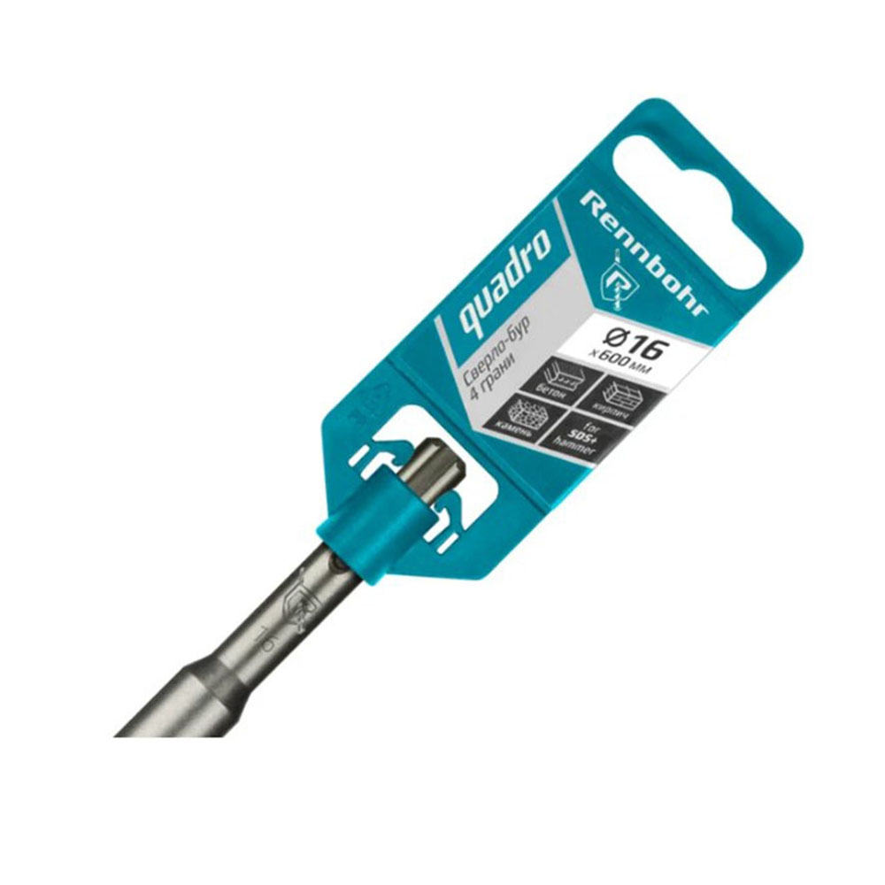Бур 16х600 мм SDS-plus 4 грани RENNBOHR Quadro - предназначен для сверления отверстий в бетоне (в т.ч. армированном), кирпиче, граните, клинкере, а также искусственном и натуральном камне. Буры RENNBOHR QUADRO изготовлены из высококачественной инструментальной стали 40Cr, оснащены твердосплавной пластиной с центрирующим острием и четырьмя режущими кромками, что обеспечивает максимальную производительность и износостойкость.