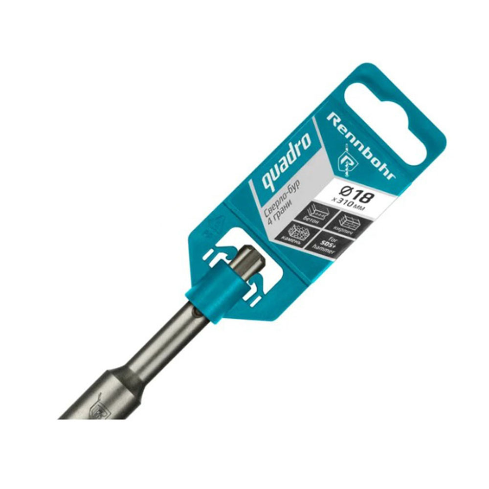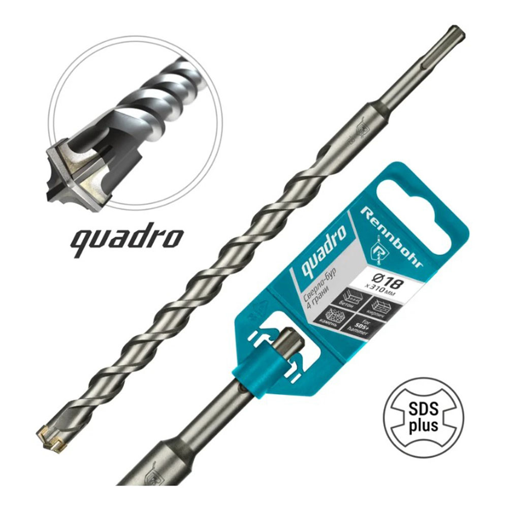 Бур 18х310 мм SDS-plus 4 грани RENNBOHR Quadro - предназначен для сверления отверстий в бетоне (в т.ч. армированном), кирпиче, граните, клинкере, а также искусственном и натуральном камне. Буры RENNBOHR QUADRO изготовлены из высококачественной инструментальной стали 40Cr, оснащены твердосплавной пластиной с центрирующим острием и четырьмя режущими кромками, что обеспечивает максимальную производительность и износостойкость.