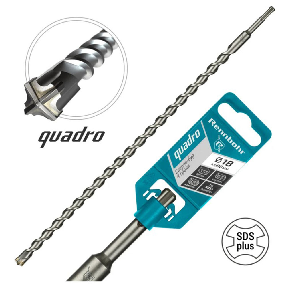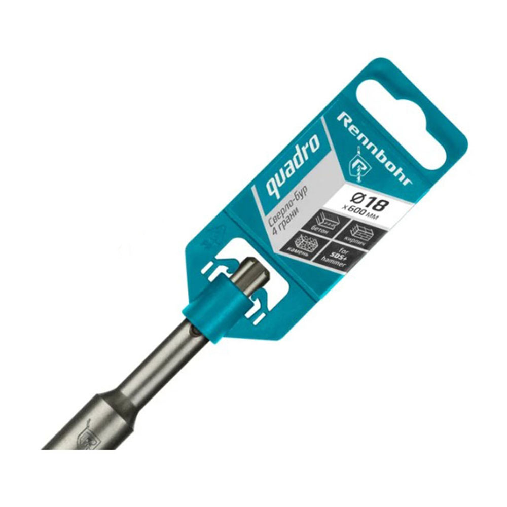 Бур 18х600 мм SDS-plus 4 грани RENNBOHR Quadro - предназначен для сверления отверстий в бетоне (в т.ч. армированном), кирпиче, граните, клинкере, а также искусственном и натуральном камне. Буры RENNBOHR QUADRO изготовлены из высококачественной инструментальной стали 40Cr, оснащены твердосплавной пластиной с центрирующим острием и четырьмя режущими кромками, что обеспечивает максимальную производительность и износостойкость.