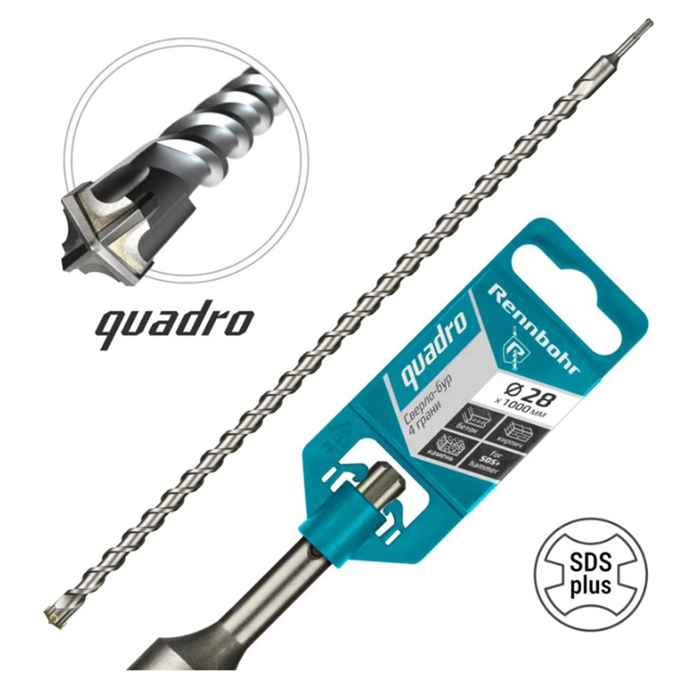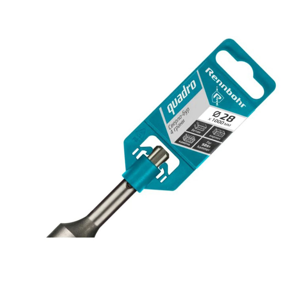 Бур 28х1000 мм SDS-plus 4 грани RENNBOHR Quadro - предназначен для сверления отверстий в бетоне (в т.ч. армированном), кирпиче, граните, клинкере, а также искусственном и натуральном камне. Буры RENNBOHR QUADRO изготовлены из высококачественной инструментальной стали 40Cr, оснащены твердосплавной пластиной с центрирующим острием и четырьмя режущими кромками, что обеспечивает максимальную производительность и износостойкость.