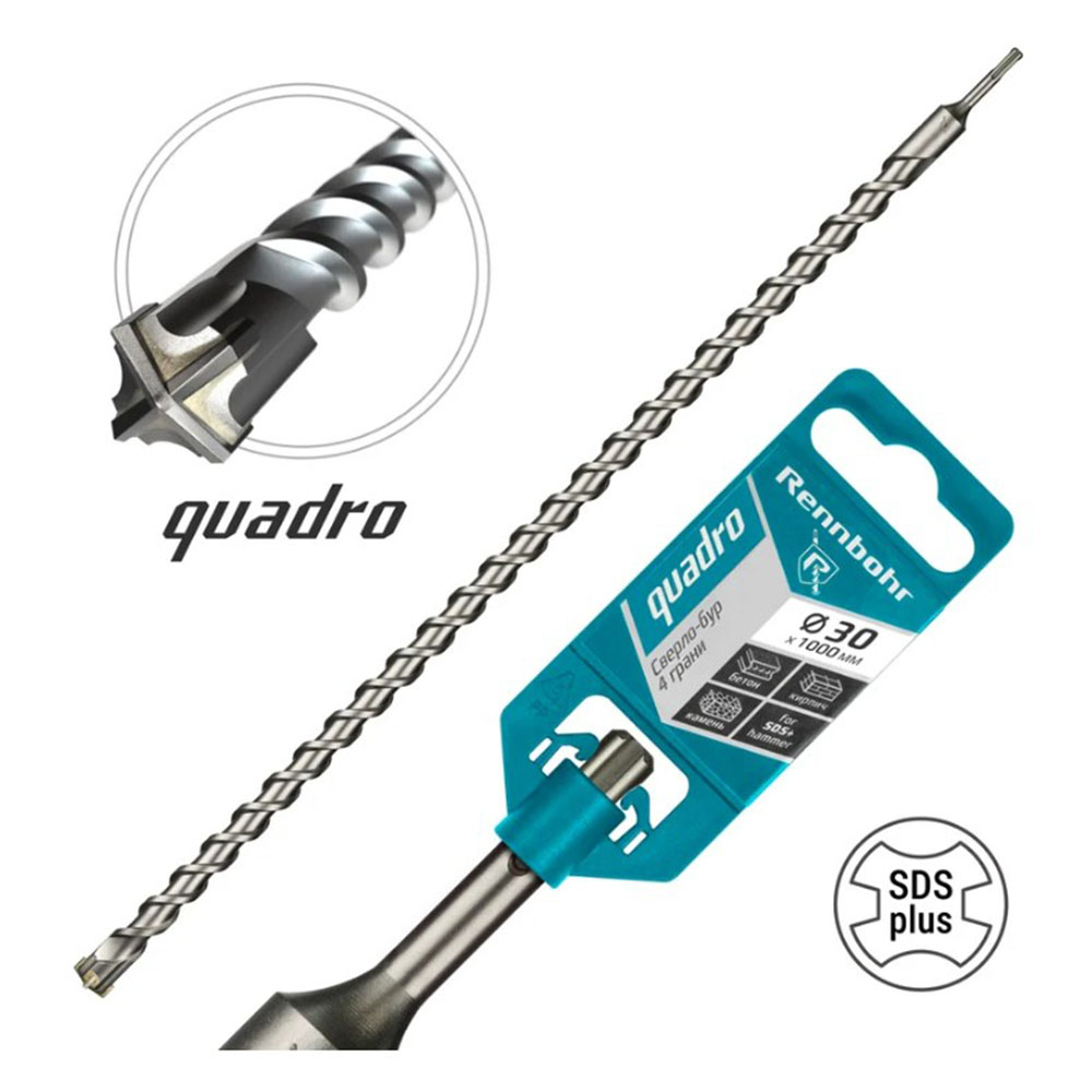 Бур 30х1000 мм SDS-plus 4 грани RENNBOHR Quadro - предназначен для сверления отверстий в бетоне (в т.ч. армированном), кирпиче, граните, клинкере, а также искусственном и натуральном камне. Буры RENNBOHR QUADRO изготовлены из высококачественной инструментальной стали 40Cr, оснащены твердосплавной пластиной с центрирующим острием и четырьмя режущими кромками, что обеспечивает максимальную производительность и износостойкость.