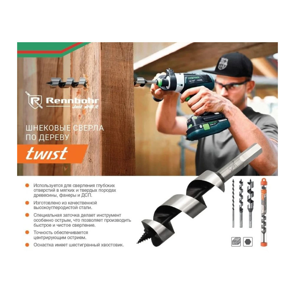 Сверло спиральное 24х230 мм RENNBOHR Twist - используется для сверления глубоких отверстий в мягких и твердых породах древесины, фанеры и ДСП. Изготовлено из качественной