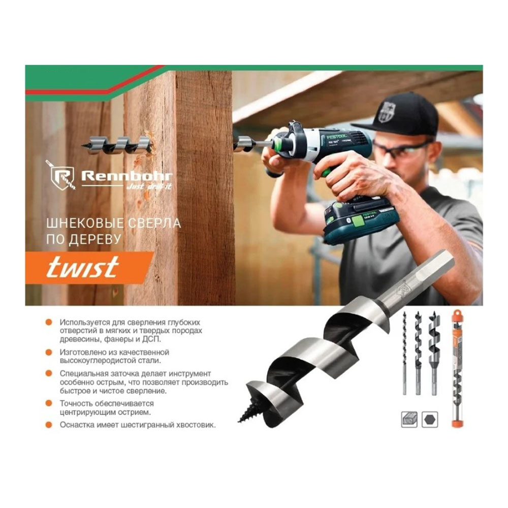 Сверло спиральное 35х460 мм RENNBOHR Twist - используется для сверления глубоких отверстий в мягких и твердых породах древесины, фанеры и ДСП. Изготовлено из качественной высокоуглеродистой стали. Специальная заточка делает инструмент особенно острым, что позволяет производить быстрое и чистое сверление. Точность обеспечивается центрирующим острием. Оснастка имеет шестигранный хвостовик.