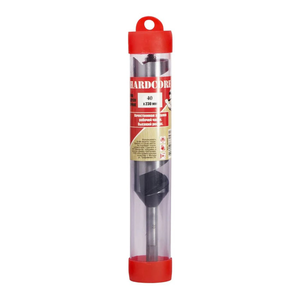 Сверло спиральное по дереву 40х230 мм Hardcore - предназначено для дрелей. Применяется для сверления отверстий в древесине. Сверление производится только в безударном режиме! Ударный режим способен моментально сделать сверло непригодным к работе. Изготовлено из высококачественной высокоуглеродистой инструментальной стали. Оснастка имеет резьбовой наконечник и шестигранный хвостовик.