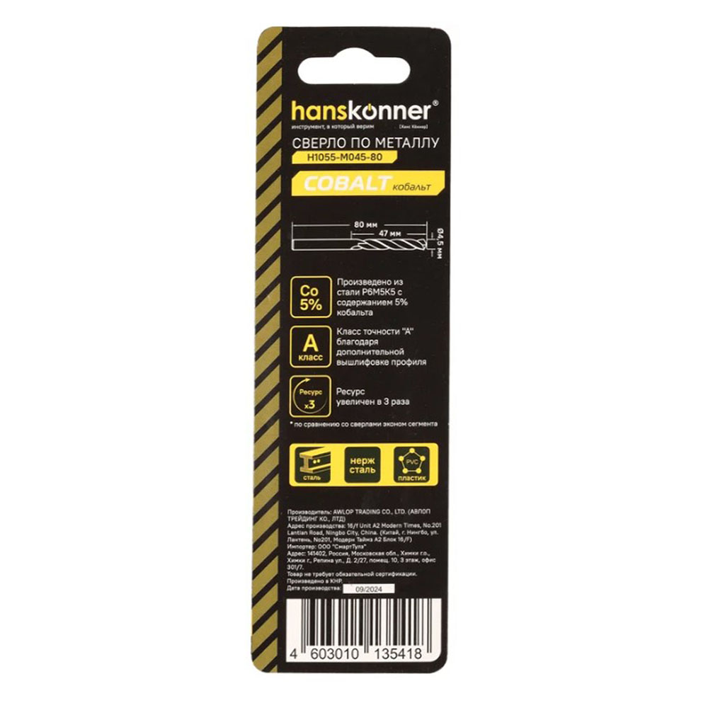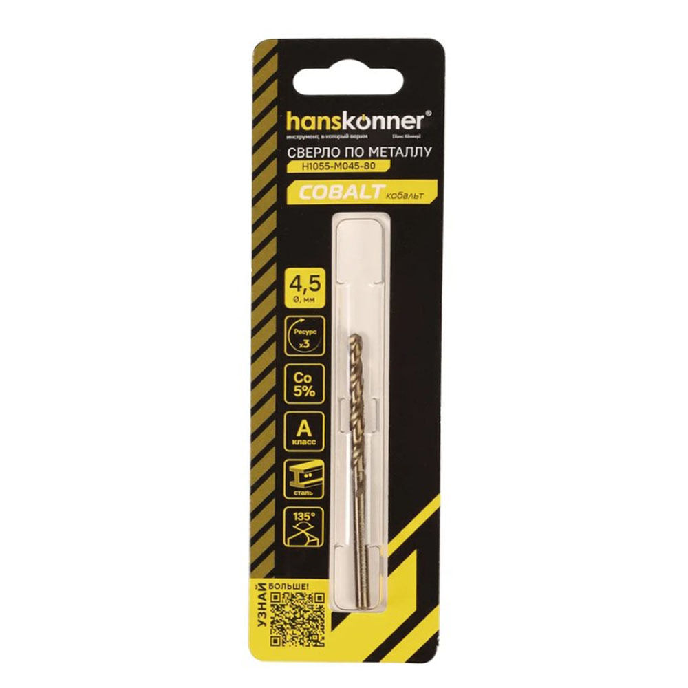 Сверло по металлу кобальт 4,5 мм Hanskonner - представляет собой надежный инструмент для работы с металлическими материалами. Изготовленное из высококачественной стали, оно обеспечивает долговечность и устойчивость к износу. Спиральная форма стружкоотвода способствует эффективному удалению стружки, что улучшает производительность и точность сверления. Цилиндрический хвостовик обеспечивает надежную фиксацию в патроне, а угол заточки 135 градусов способствует легкому началу сверления и снижает риск смещения. Это сверло идеально подходит для профессионального использования, обеспечивая высокую точность и качество обработки.
